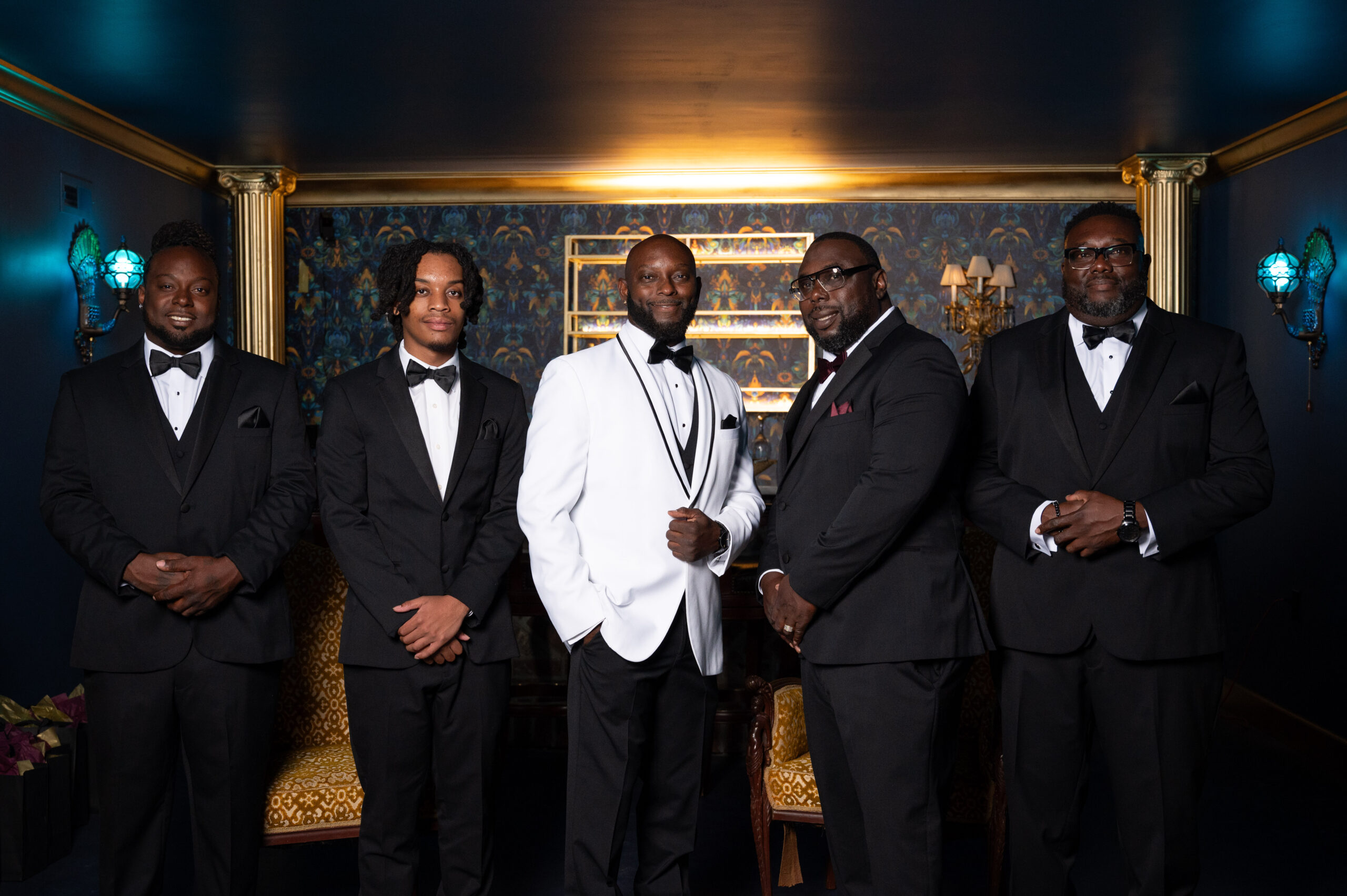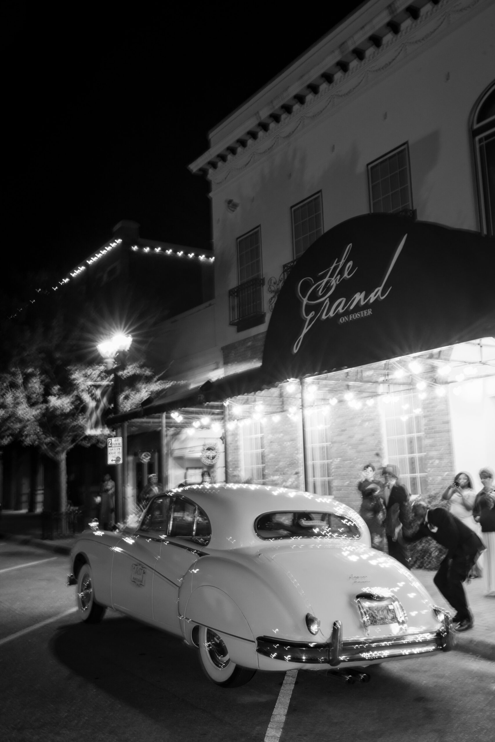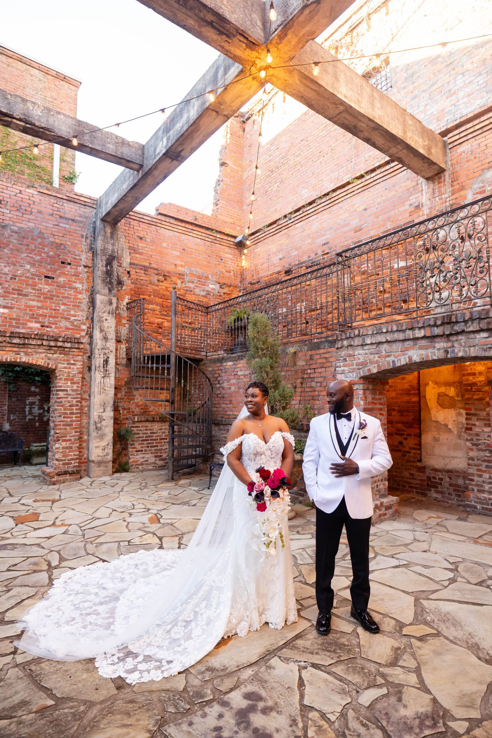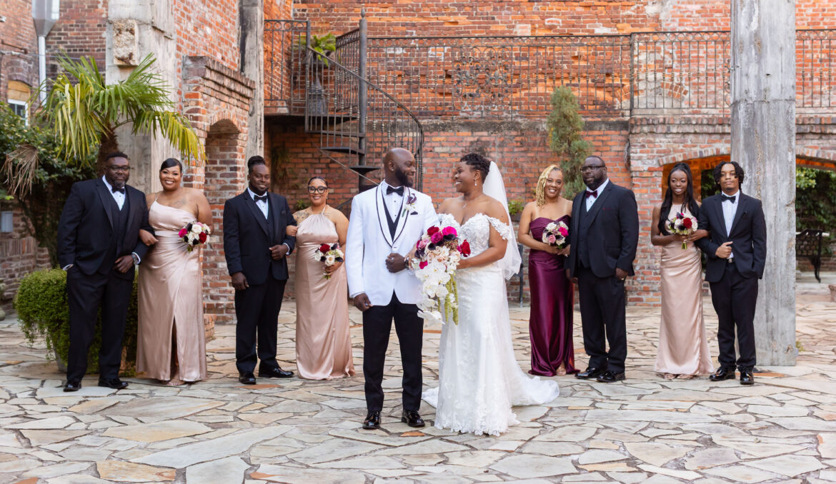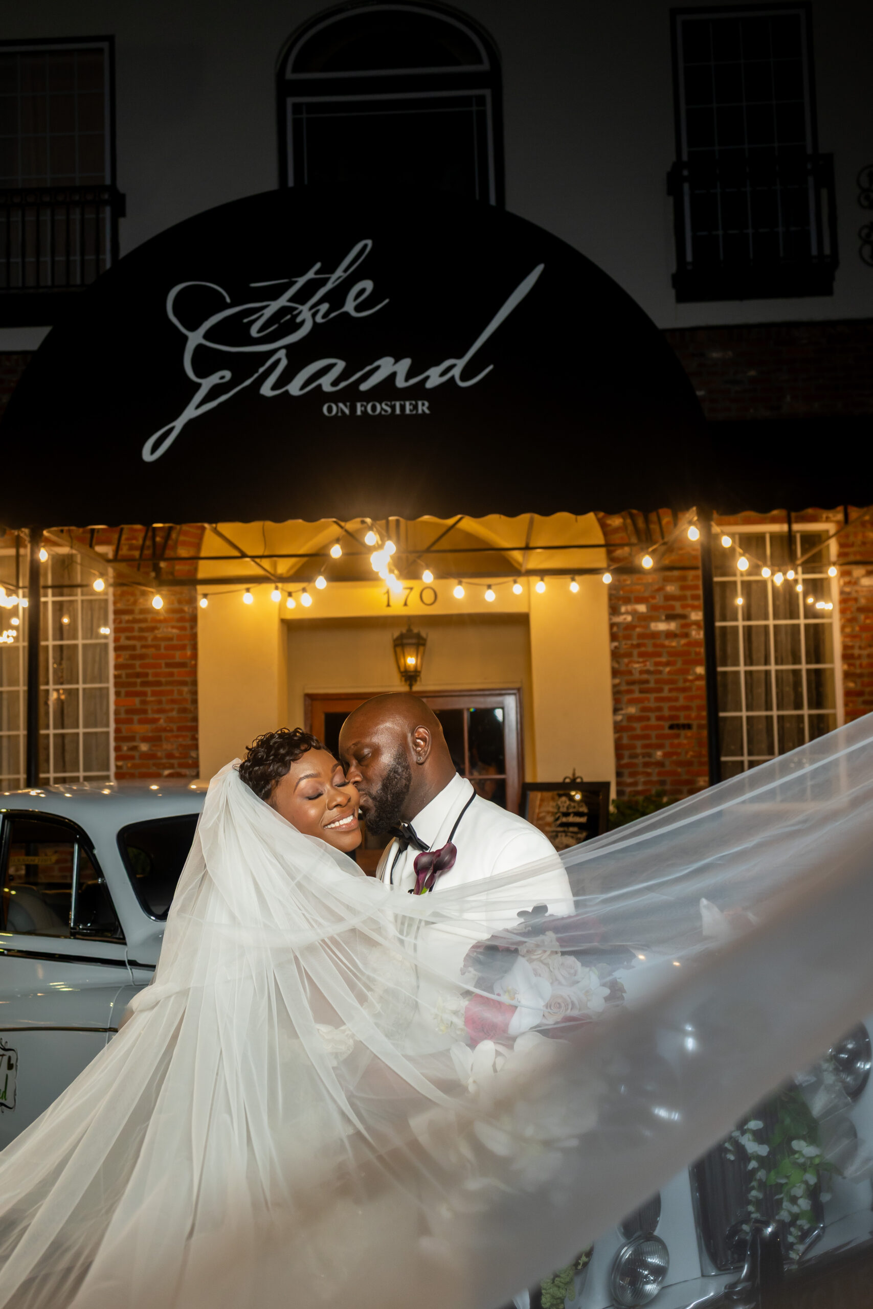 Bridal Gown: Suite Bridal, Atlanta. Bridal Gown Alterations: VMartin Alterations. Bridal Reception Dress, MOB Attire: Mac Duggal. Bridesmaid Gowns: David’s Bridal. Cake: Tara’s Temptation. Catering: Ketchem’s Restaurant & Catering. Ceremony & Reception Venue: The Grand on Foster. Cocktails & Bar Service: Cheers Refreshment Services. Floral Design: Rachel Barrentine. Groom’s & Groomsmen’s Attire: Tuxedo Unlimited. Groom’s & Groomsmen’s Barber: Fred Means – Means Unique Kutz. Groom’s Reception Tuxedo: Express. Hair Stylist: Gabrielle Kappell – The Vanity Bar Salon & Suites. Lighting & Drapery: Premier Mobile DJ Services. Linen: David Parker. Live Artist: Melissa Munger. Makeup Artist: Denicea Hicks – Styles by Denicea. Music/Entertainment: Saxaphonist Chris Godber, Premier Mobile DJ Services. Photography: Sam Jasper Photography. Rings: Reeds Jewelers. Stationery: Elegant Wedding Invites. Transportation: JEB’s Vintage. Videography: Steve Frank Films. Wedding Coordinator: Kimberly Smith Events.