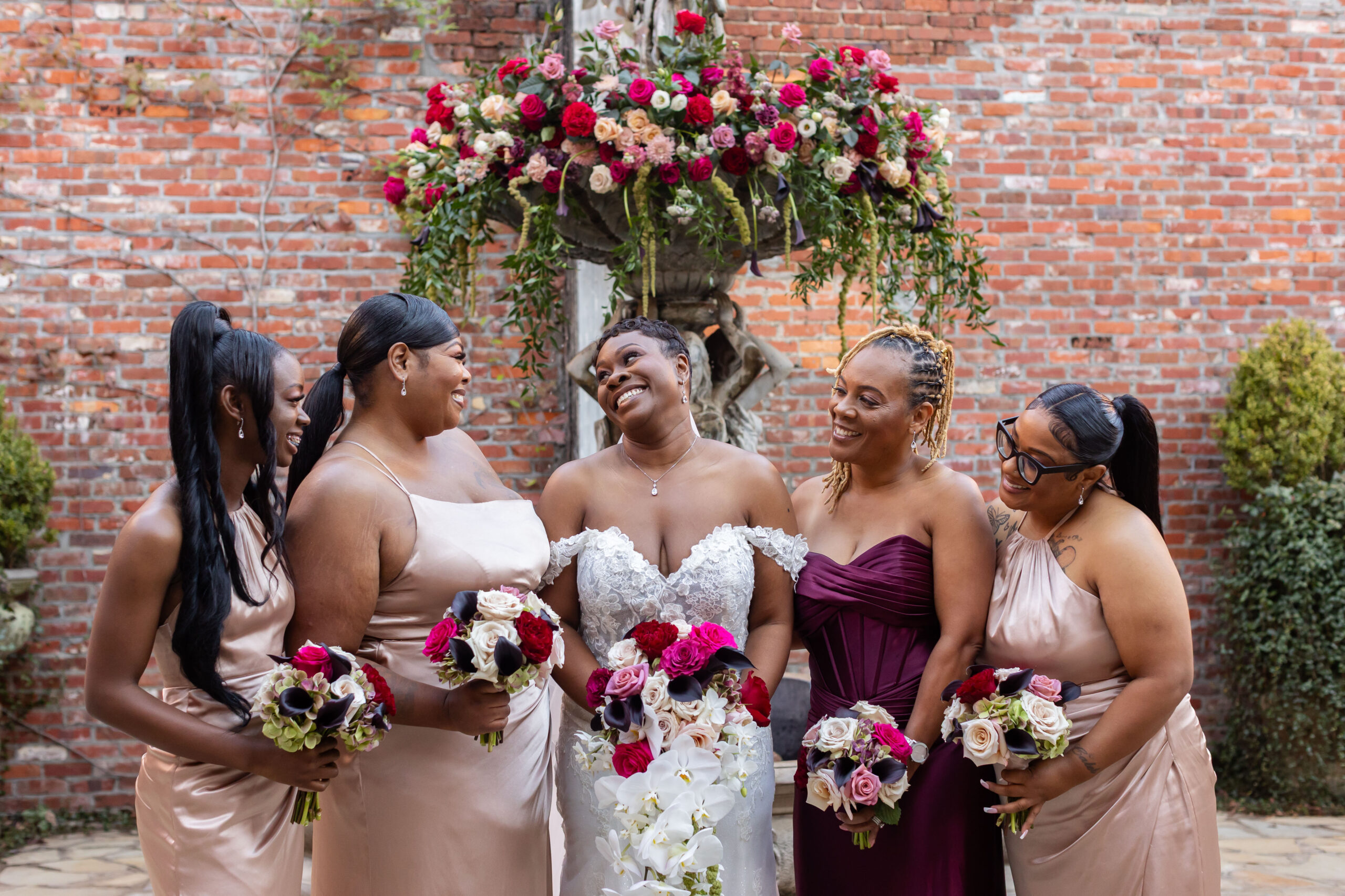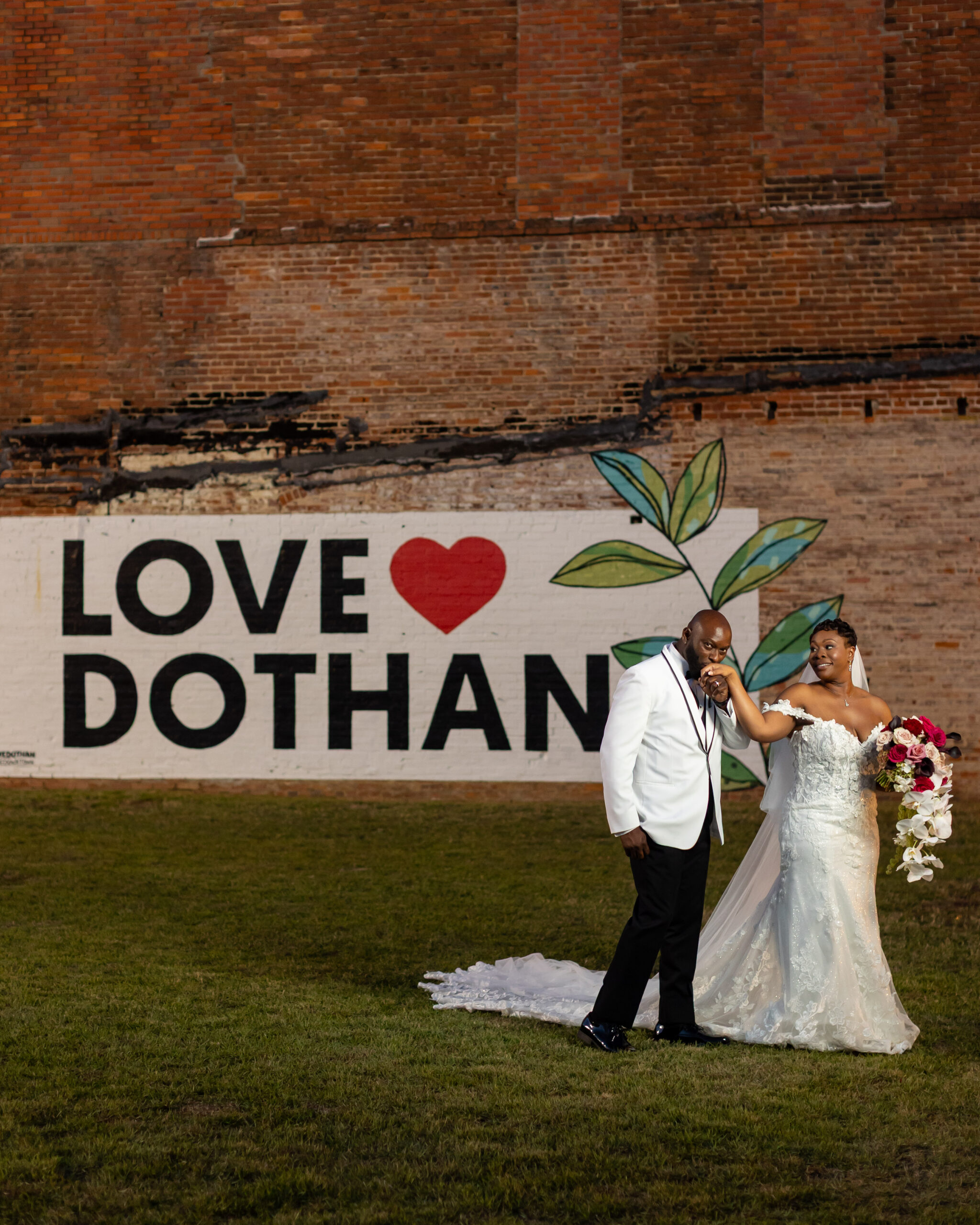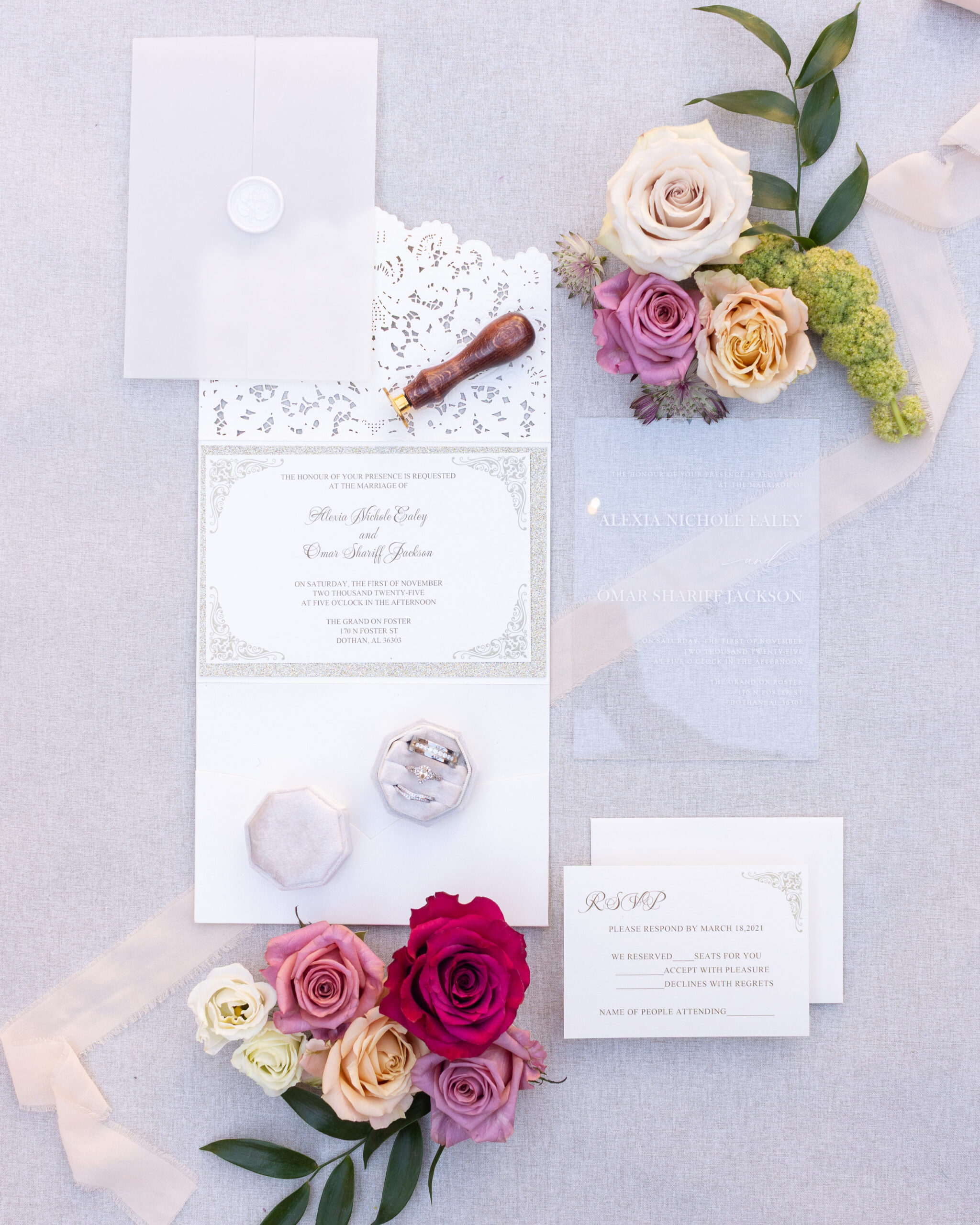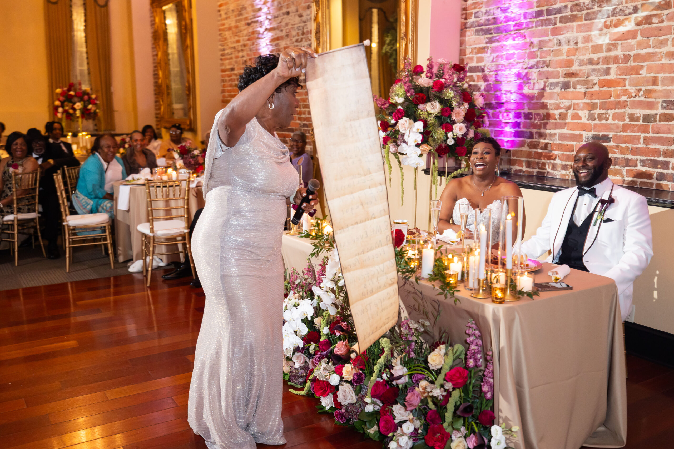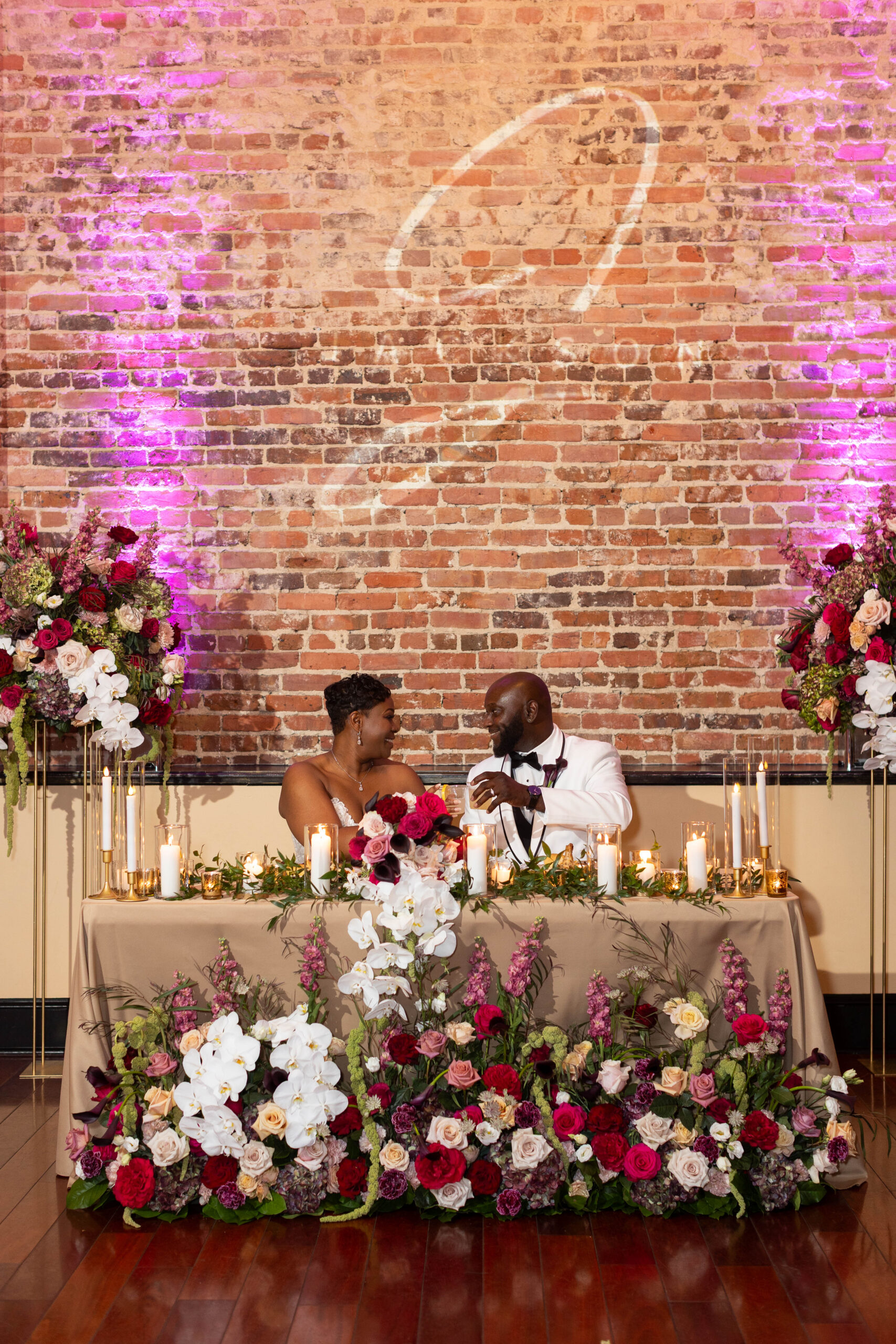 Bridal Gown: Suite Bridal, Atlanta. Bridal Gown Alterations: VMartin Alterations. Bridal Reception Dress, MOB Attire: Mac Duggal. Bridesmaid Gowns: David’s Bridal. Cake: Tara’s Temptation. Catering: Ketchem’s Restaurant & Catering. Ceremony & Reception Venue: The Grand on Foster. Cocktails & Bar Service: Cheers Refreshment Services. Floral Design: Rachel Barrentine. Groom’s & Groomsmen’s Attire: Tuxedo Unlimited. Groom’s & Groomsmen’s Barber: Fred Means – Means Unique Kutz. Groom’s Reception Tuxedo: Express. Hair Stylist: Gabrielle Kappell – The Vanity Bar Salon & Suites. Lighting & Drapery: Premier Mobile DJ Services. Linen: David Parker. Live Artist: Melissa Munger. Makeup Artist: Denicea Hicks – Styles by Denicea. Music/Entertainment: Saxaphonist Chris Godber, Premier Mobile DJ Services. Photography: Sam Jasper Photography. Rings: Reeds Jewelers. Stationery: Elegant Wedding Invites. Transportation: JEB’s Vintage. Videography: Steve Frank Films. Wedding Coordinator: Kimberly Smith Events.
