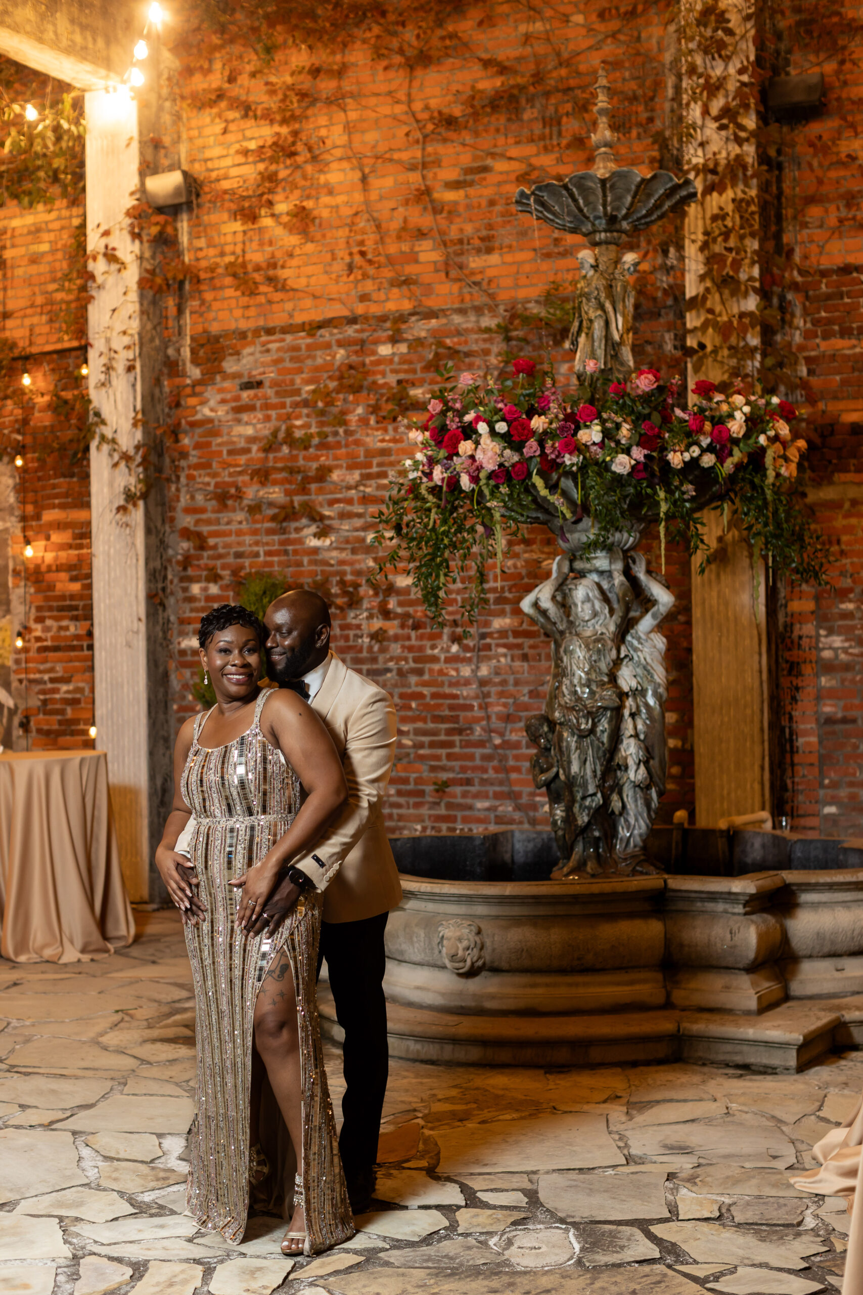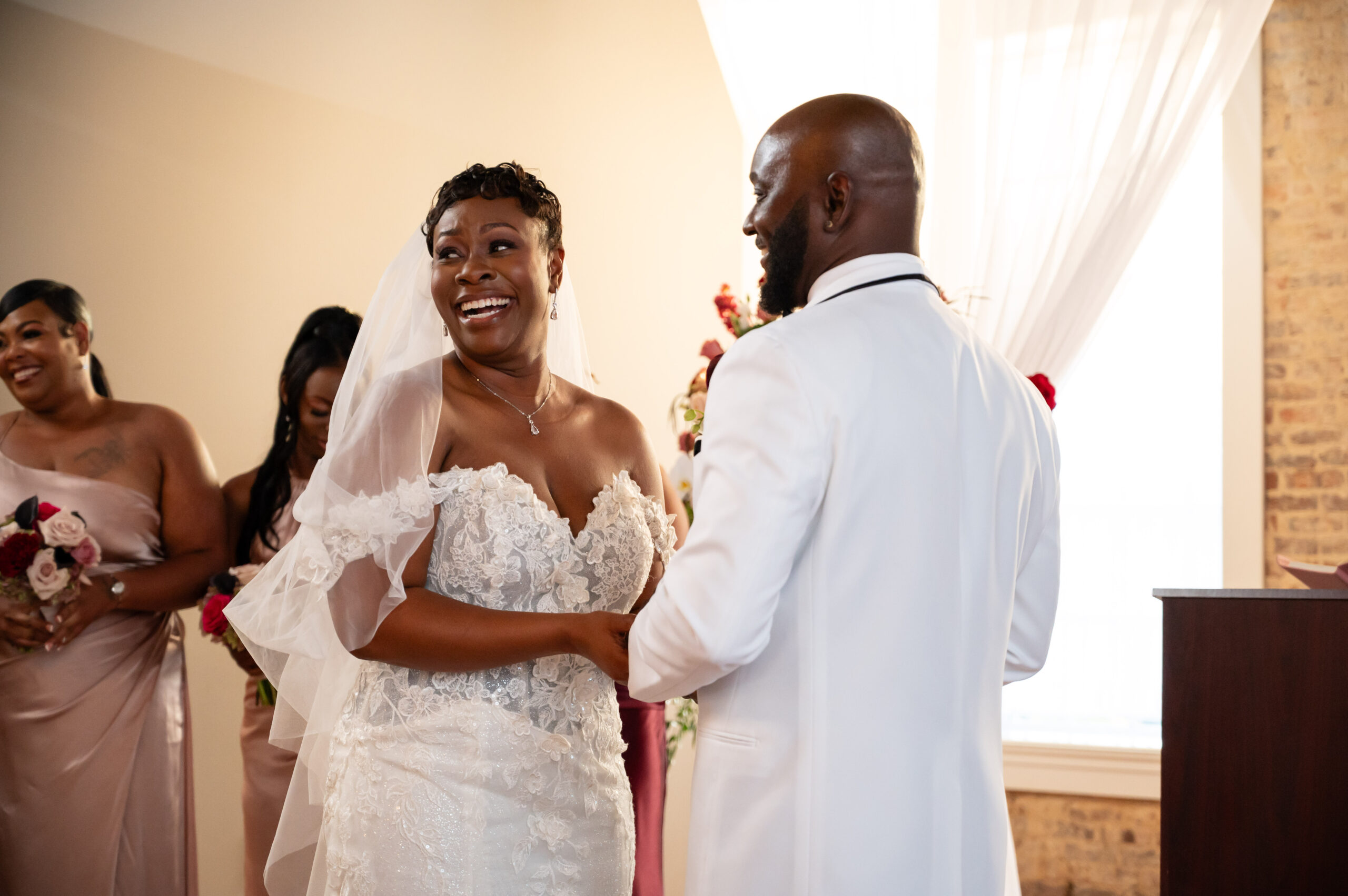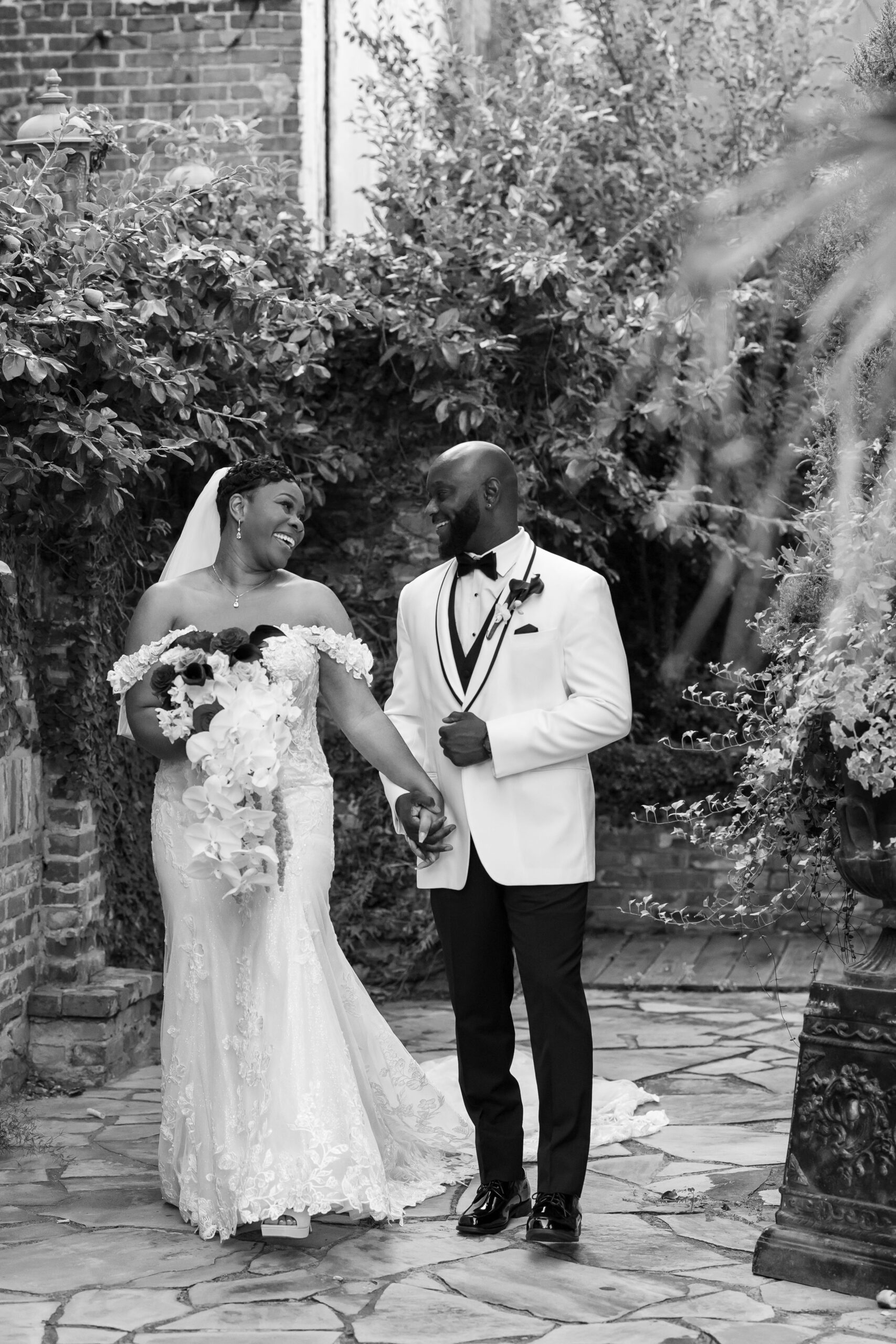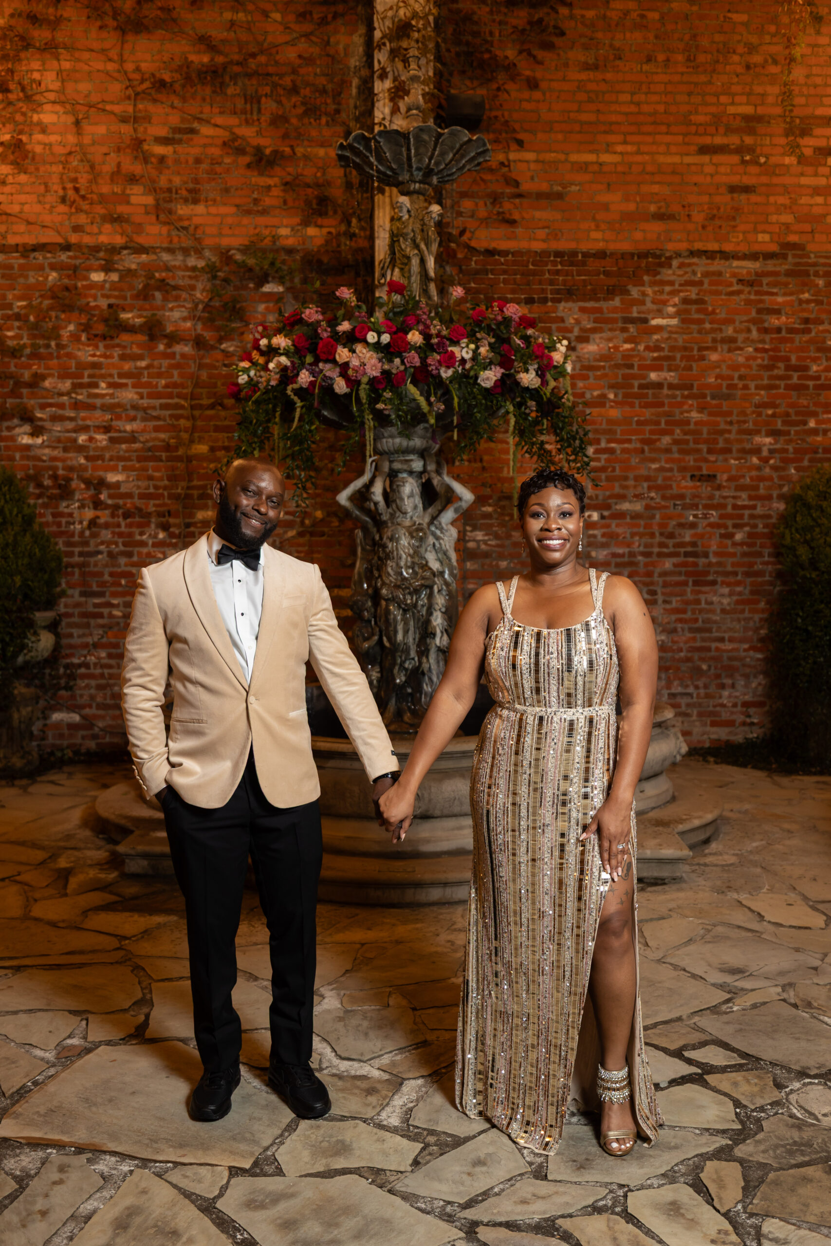 Bridal Gown: Suite Bridal, Atlanta. Bridal Gown Alterations: VMartin Alterations. Bridal Reception Dress, MOB Attire: Mac Duggal. Bridesmaid Gowns: David’s Bridal. Cake: Tara’s Temptation. Catering: Ketchem’s Restaurant & Catering. Ceremony & Reception Venue: The Grand on Foster. Cocktails & Bar Service: Cheers Refreshment Services. Floral Design: Rachel Barrentine. Groom’s & Groomsmen’s Attire: Tuxedo Unlimited. Groom’s & Groomsmen’s Barber: Fred Means – Means Unique Kutz. Groom’s Reception Tuxedo: Express. Hair Stylist: Gabrielle Kappell – The Vanity Bar Salon & Suites. Lighting & Drapery: Premier Mobile DJ Services. Linen: David Parker. Live Artist: Melissa Munger. Makeup Artist: Denicea Hicks – Styles by Denicea. Music/Entertainment: Saxaphonist Chris Godber, Premier Mobile DJ Services. Photography: Sam Jasper Photography. Rings: Reeds Jewelers. Stationery: Elegant Wedding Invites. Transportation: JEB’s Vintage. Videography: Steve Frank Films. Wedding Coordinator: Kimberly Smith Events.