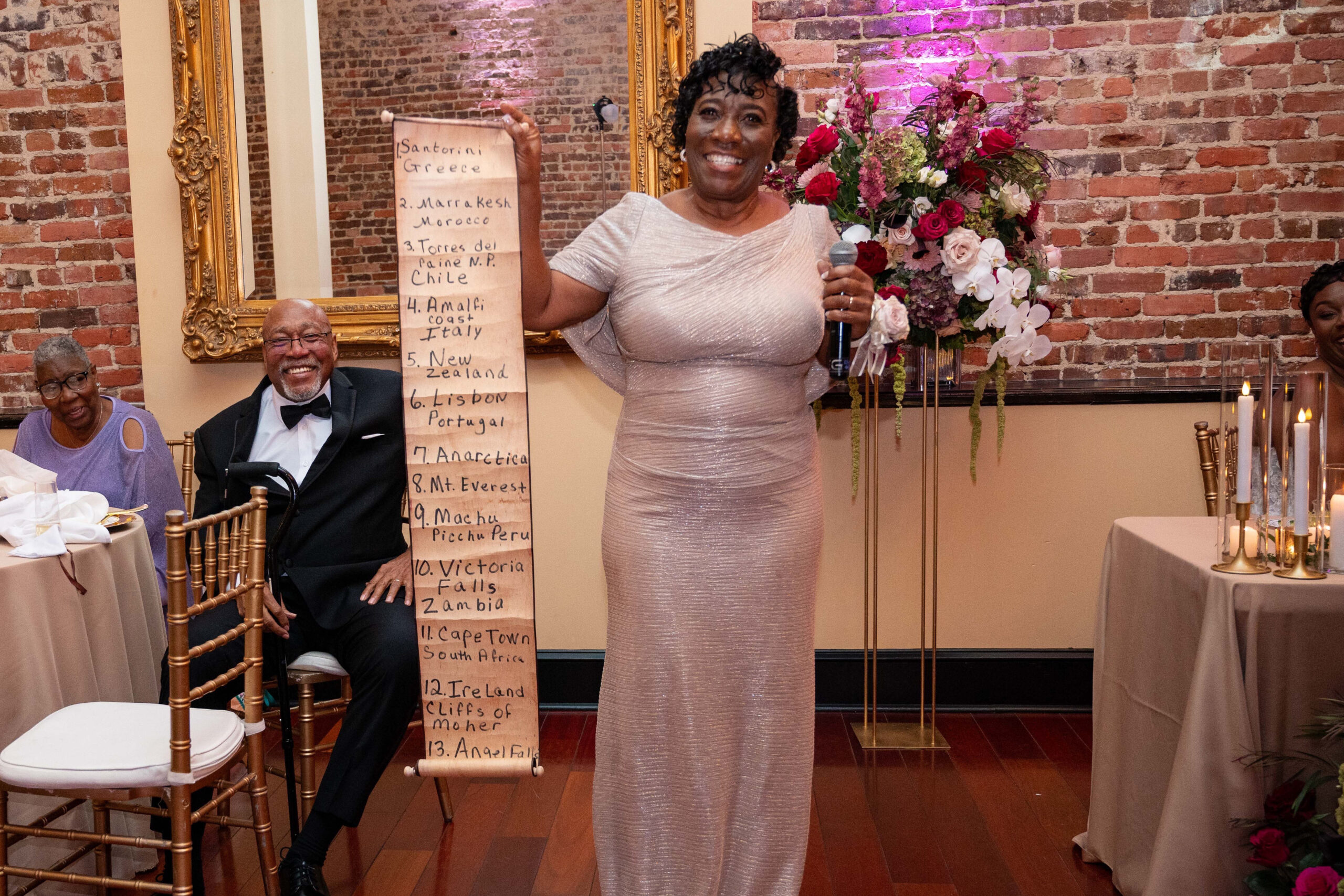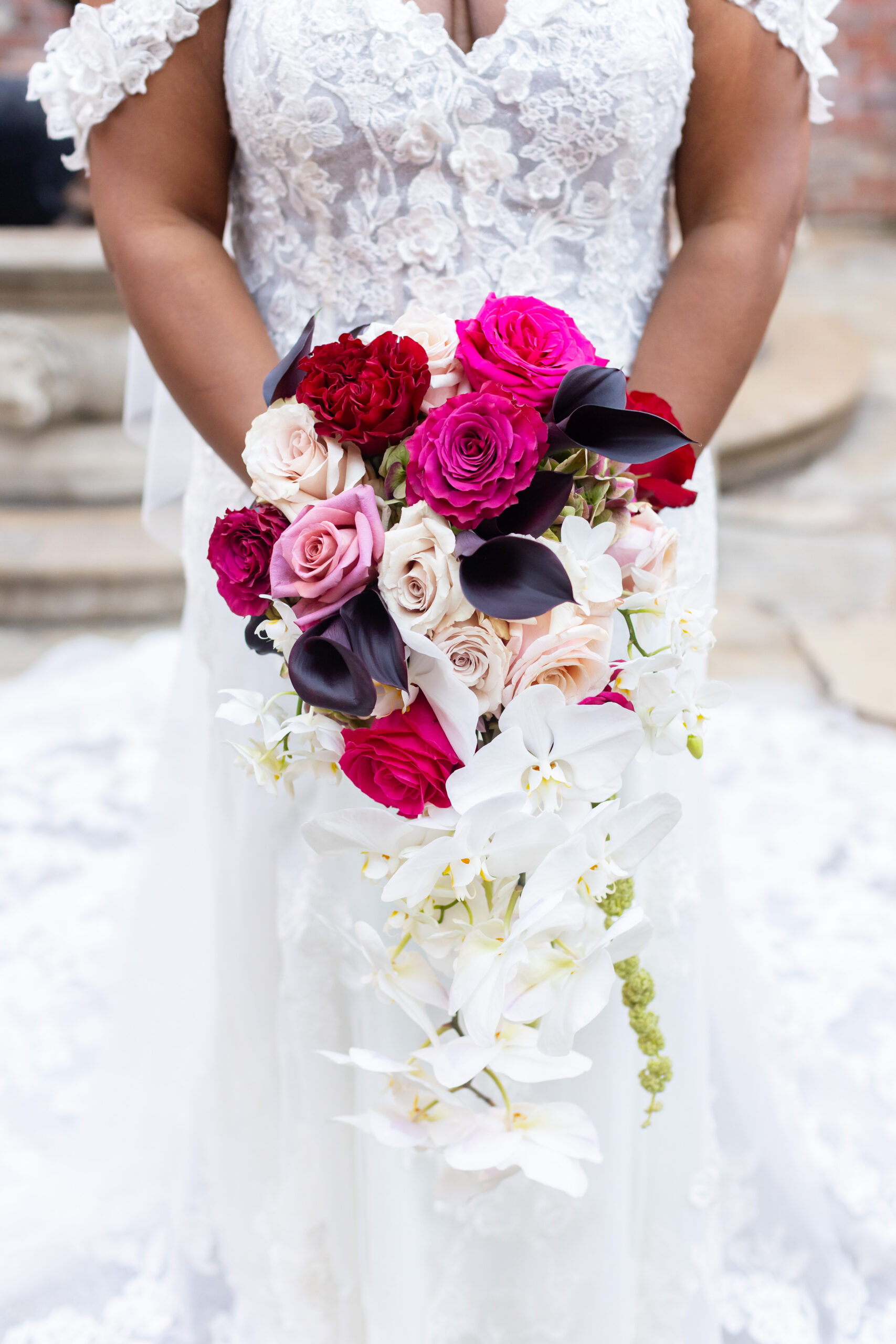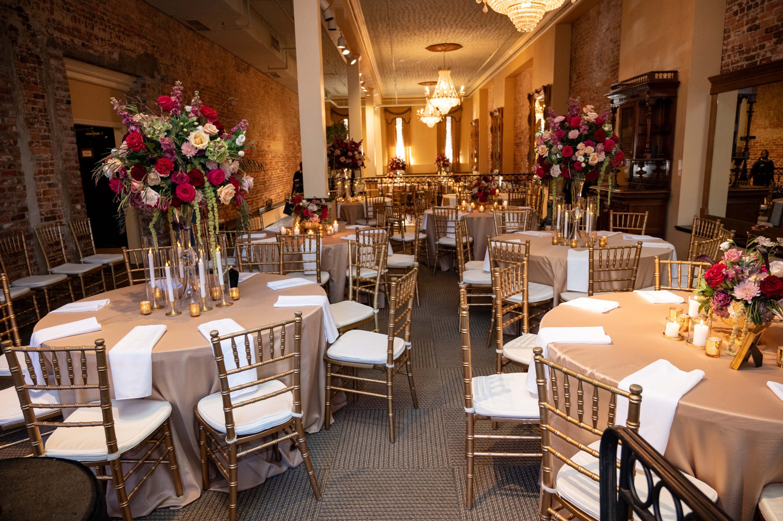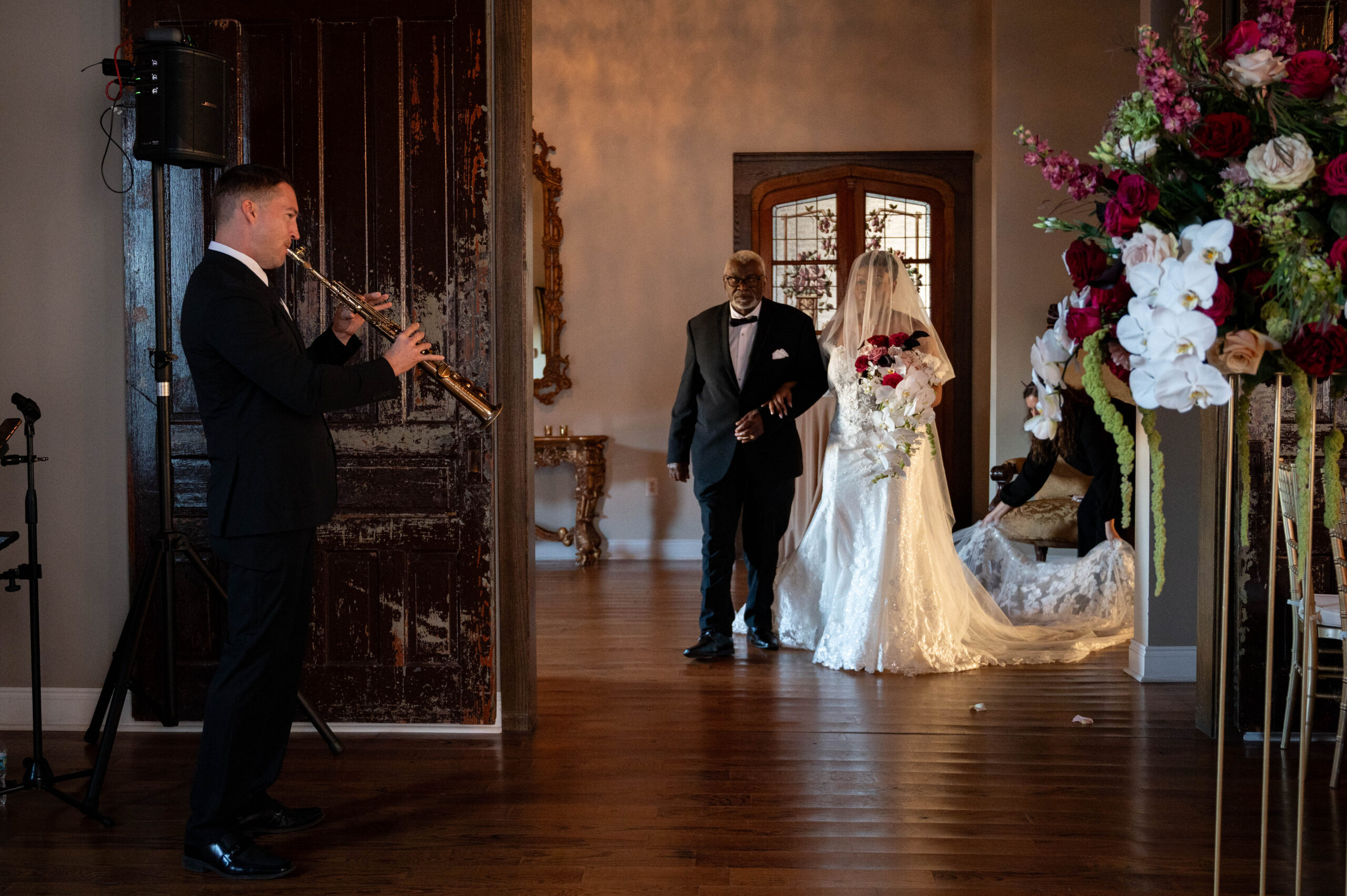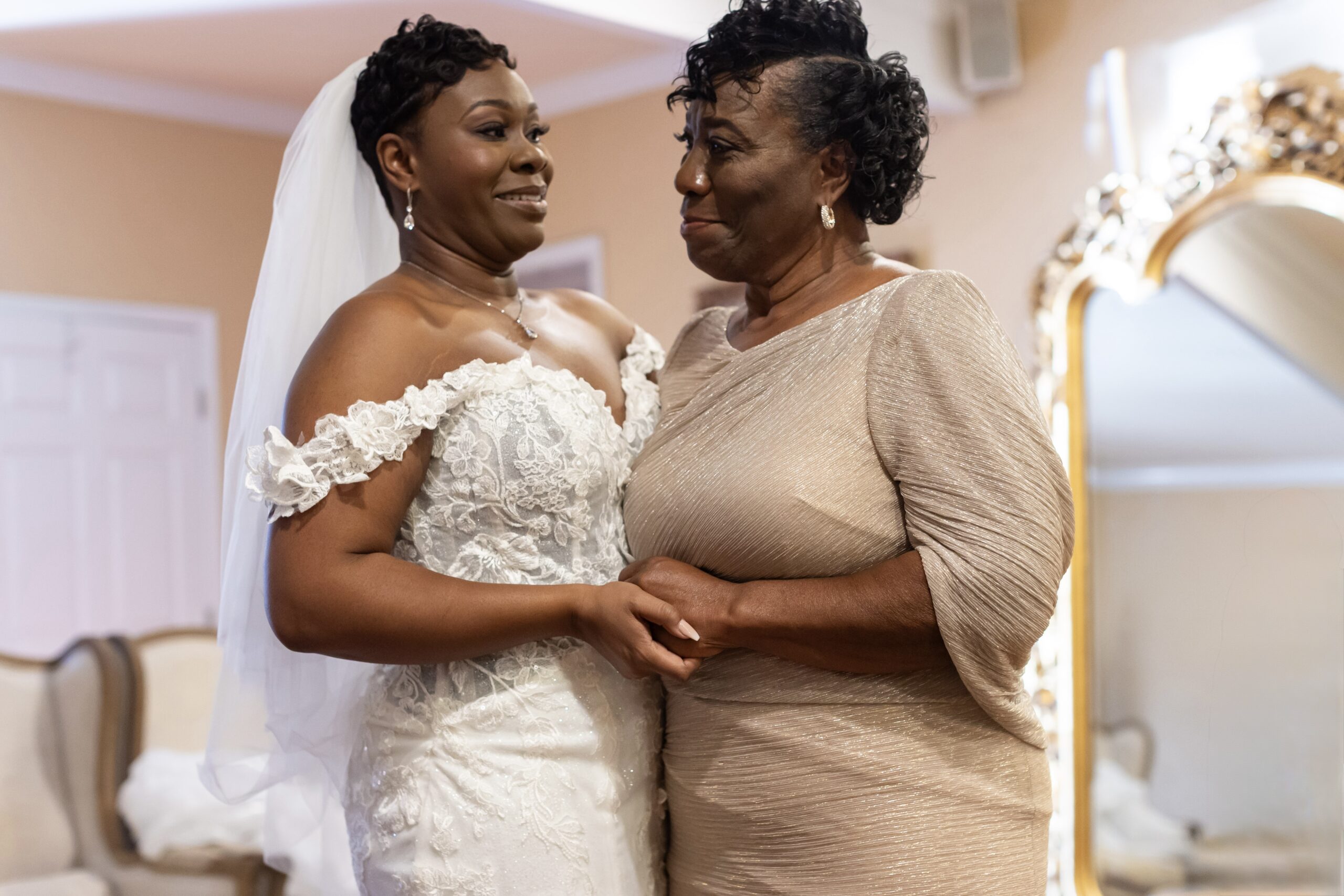 Bridal Gown: Suite Bridal, Atlanta. Bridal Gown Alterations: VMartin Alterations. Bridal Reception Dress, MOB Attire: Mac Duggal. Bridesmaid Gowns: David’s Bridal. Cake: Tara’s Temptation. Catering: Ketchem’s Restaurant & Catering. Ceremony & Reception Venue: The Grand on Foster. Cocktails & Bar Service: Cheers Refreshment Services. Floral Design: Rachel Barrentine. Groom’s & Groomsmen’s Attire: Tuxedo Unlimited. Groom’s & Groomsmen’s Barber: Fred Means – Means Unique Kutz. Groom’s Reception Tuxedo: Express. Hair Stylist: Gabrielle Kappell – The Vanity Bar Salon & Suites. Lighting & Drapery: Premier Mobile DJ Services. Linen: David Parker. Live Artist: Melissa Munger. Makeup Artist: Denicea Hicks – Styles by Denicea. Music/Entertainment: Saxaphonist Chris Godber, Premier Mobile DJ Services. Photography: Sam Jasper Photography. Rings: Reeds Jewelers. Stationery: Elegant Wedding Invites. Transportation: JEB’s Vintage. Videography: Steve Frank Films. Wedding Coordinator: Kimberly Smith Events.