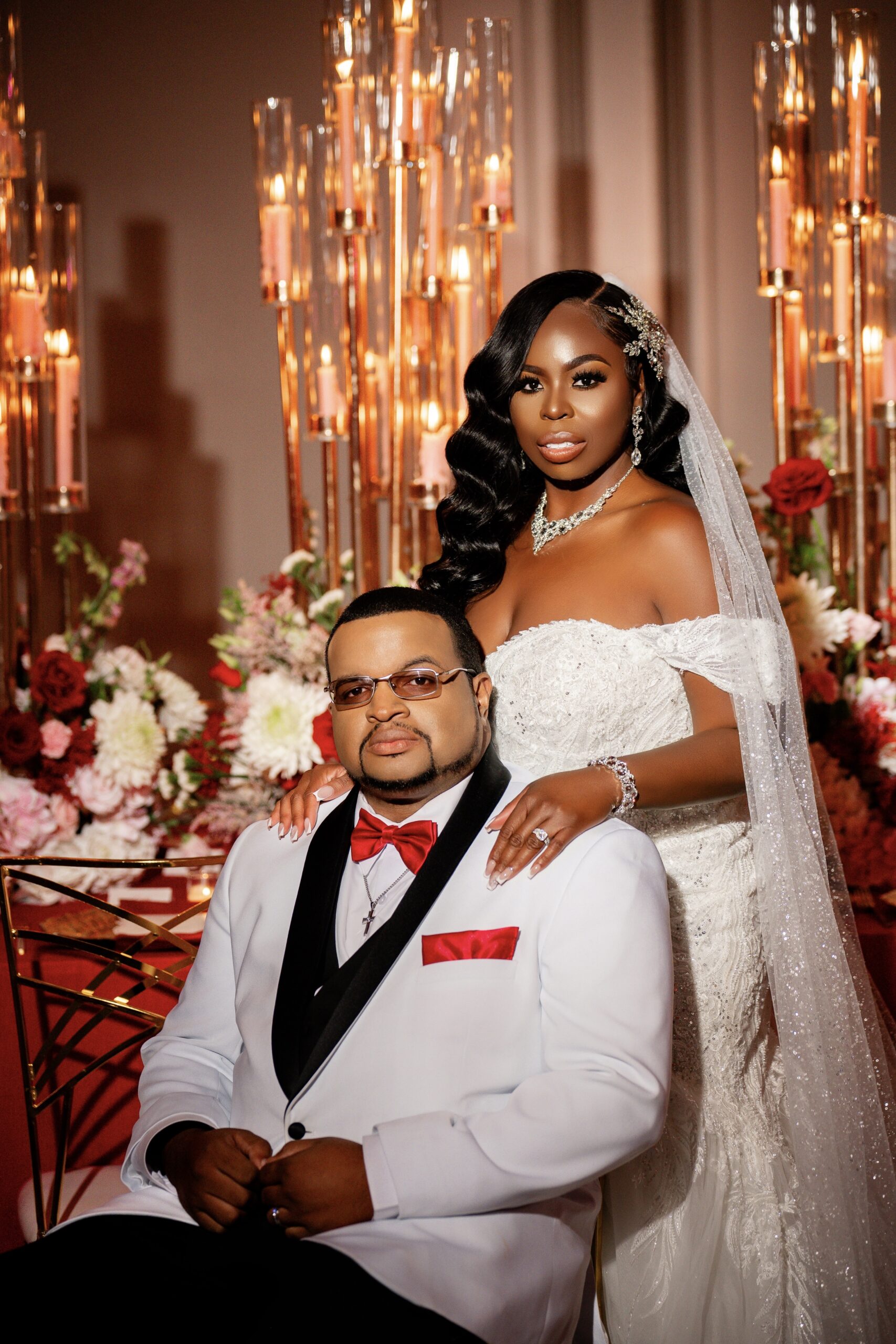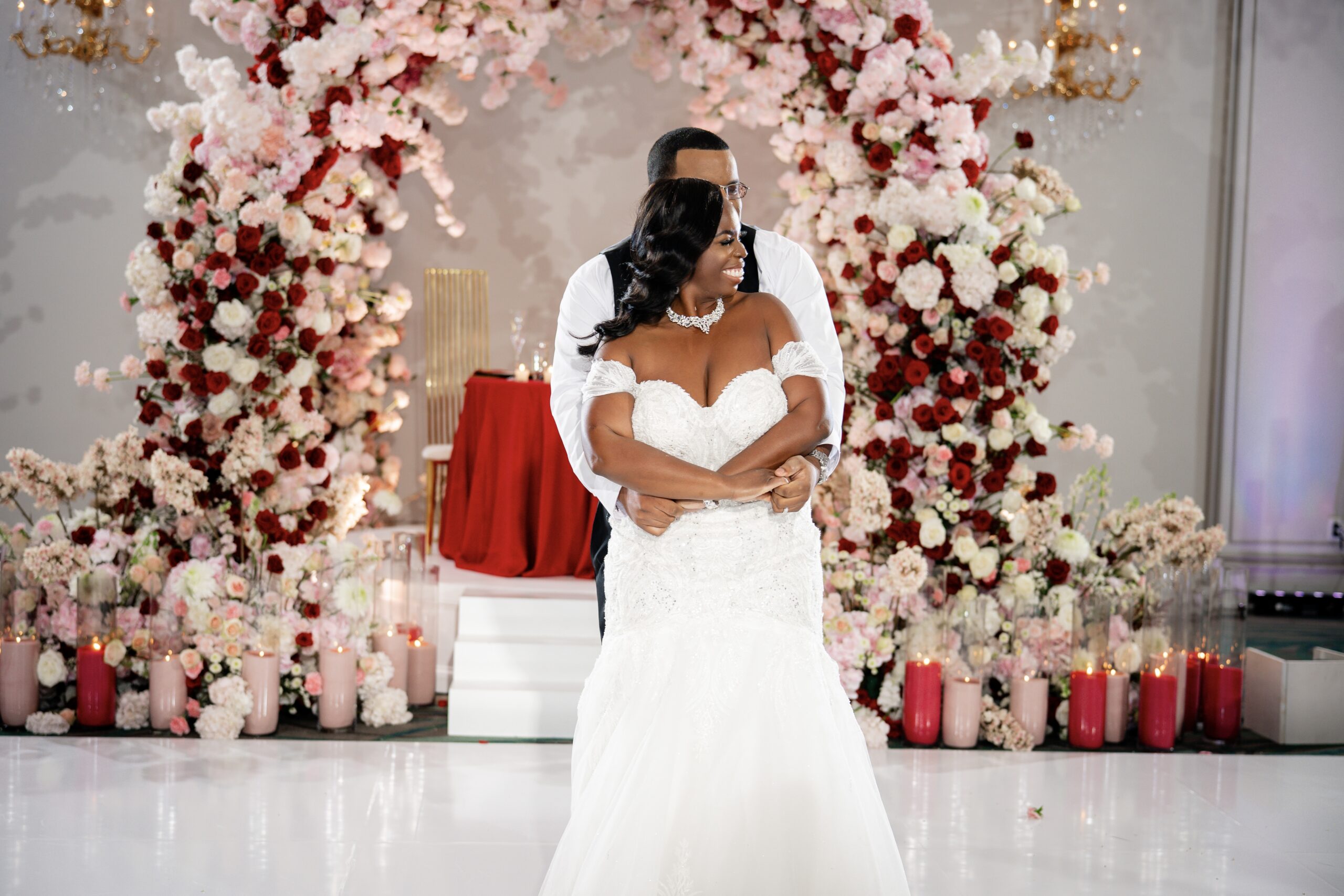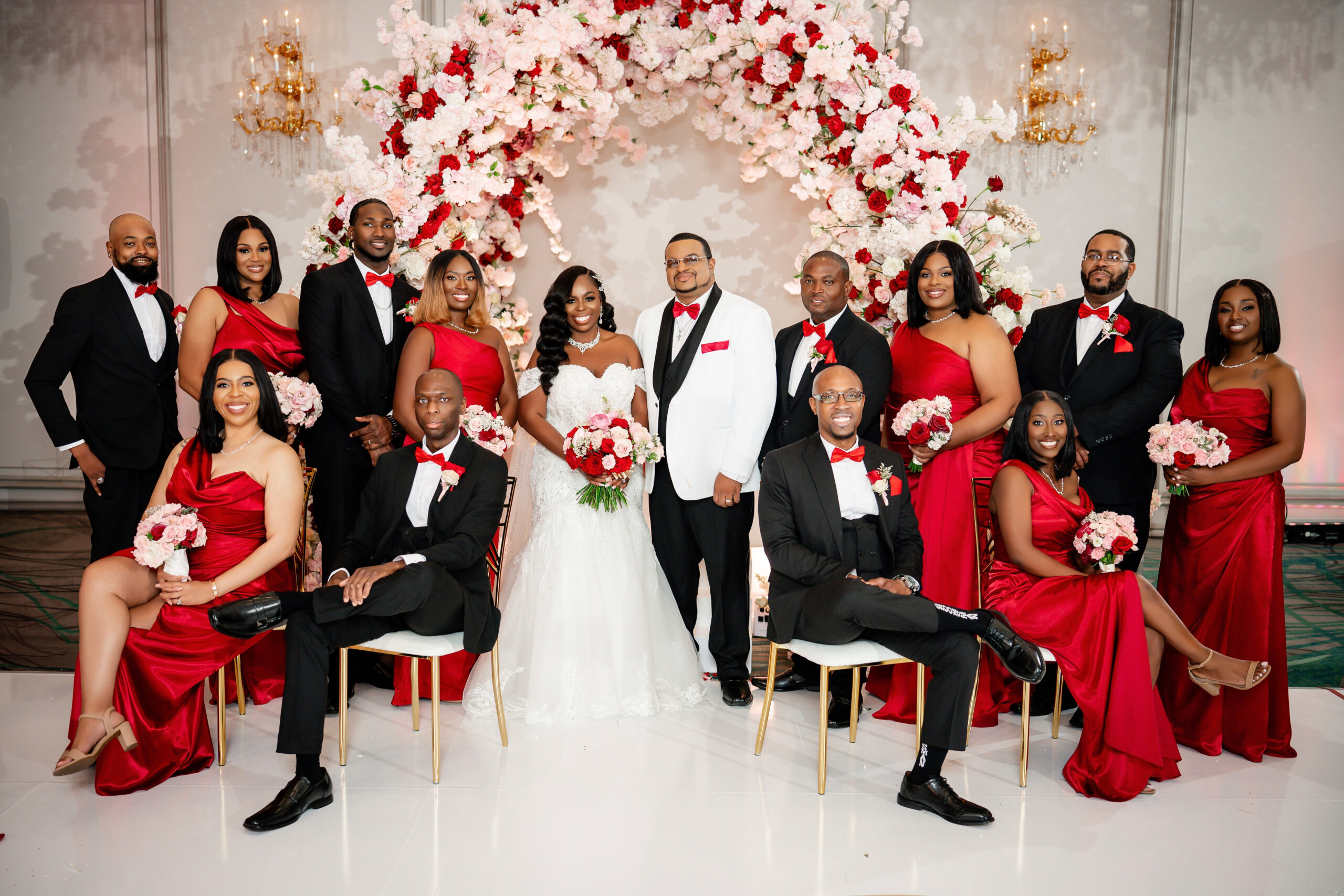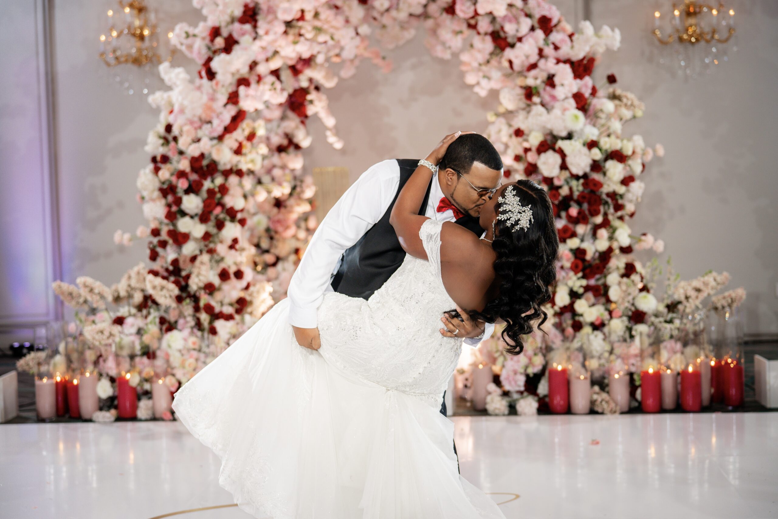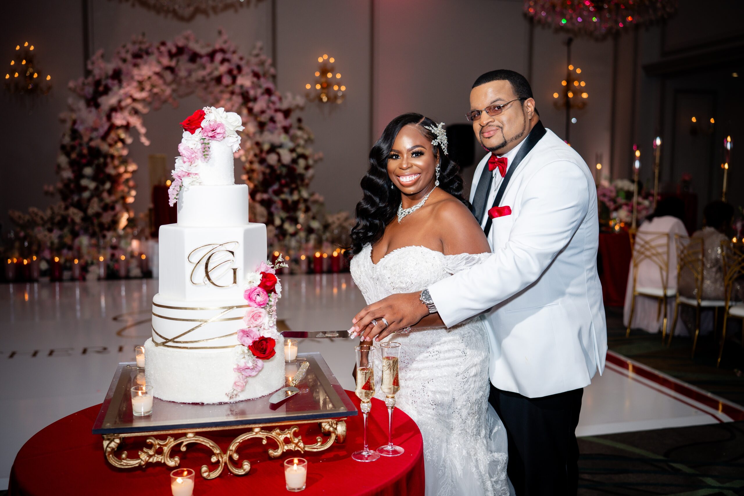 Bridal Gown: Bella’s Bridal. Bridesmaid Gowns: David’s Bridal. Cake: Barb’s Cakes. Catering, Venue, Wedding Night Accommodations: Grand Bohemian Mountain Brook. Ceremony Saxophonist: Willie Jazzanova Davis. Content Creator: De’Aundria McArthur. Custom Dance Floor Wrap: Laced Vinyl Shoppe. Event Rentals: Decor To Adore, Just Wright Events, PropHouse. Floral Design: The Perfect Creation. Groom’s Attire: Buy4Less Tuxedos. Groomsmen’s Attire: Arzel. Hair Stylist: MiRich Hair. Makeup Artist: Drea Michelle, Jasmine Jones. Lighting & Drapery, Music/Entertainment: B. Brian. Linen: Decor To Adore. MOB Gown: JJ’s House. Photography: Victor Cole Photography. Rings: Kay Jewelers. Stationery: Paper & More Creations. Transportation: Coats Classic Cars. Wedding Planner: Steele Unique Weddings & Events. Videographer: Harper Films.