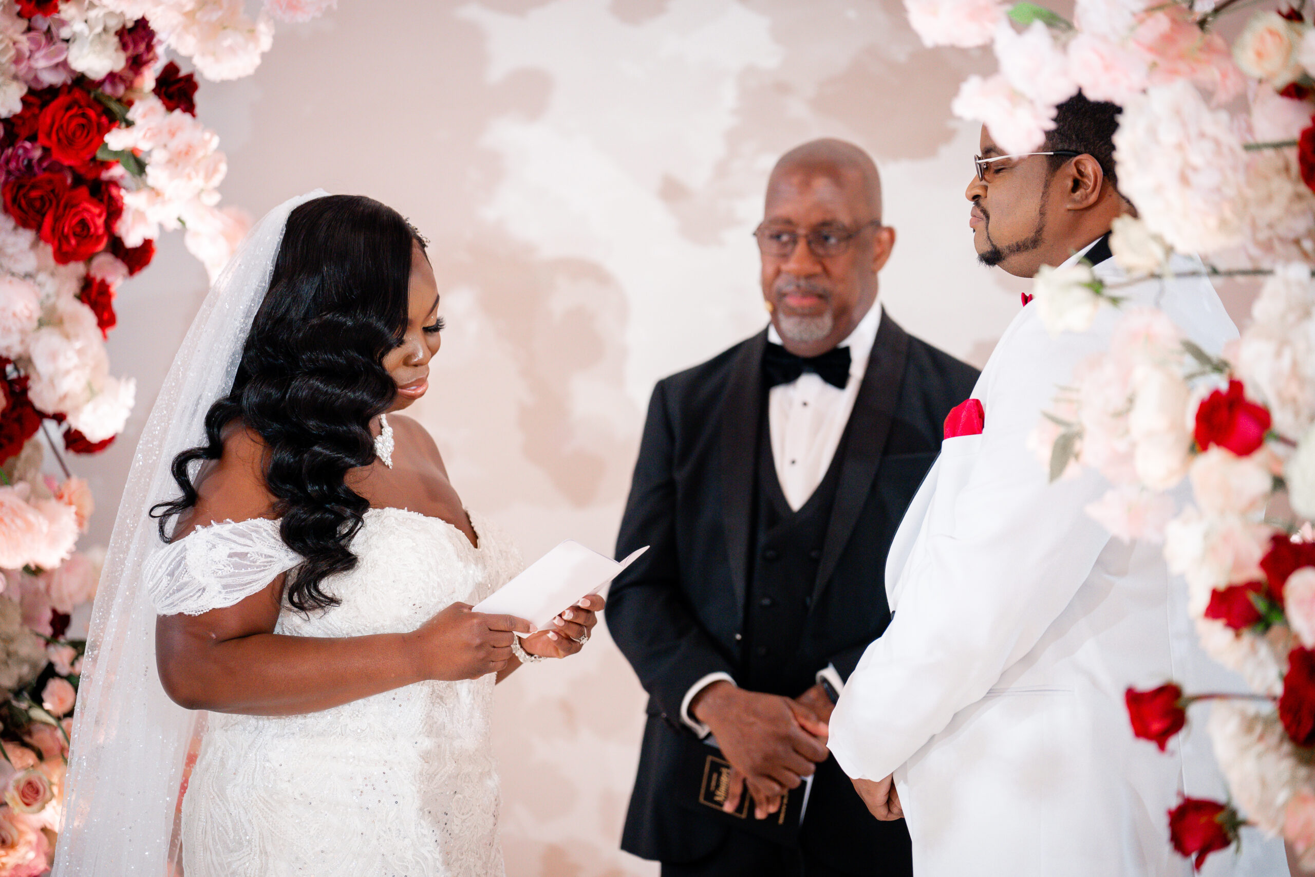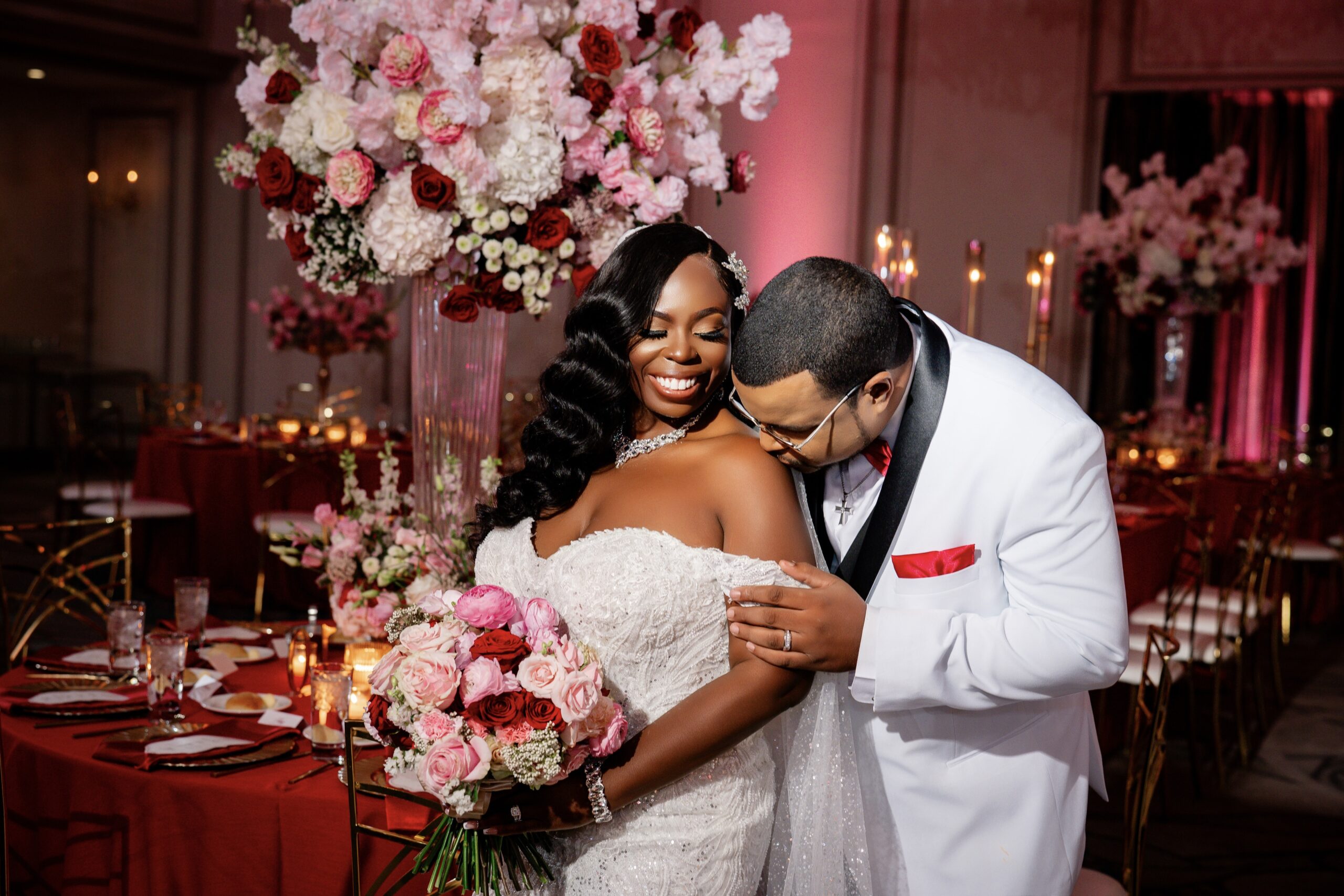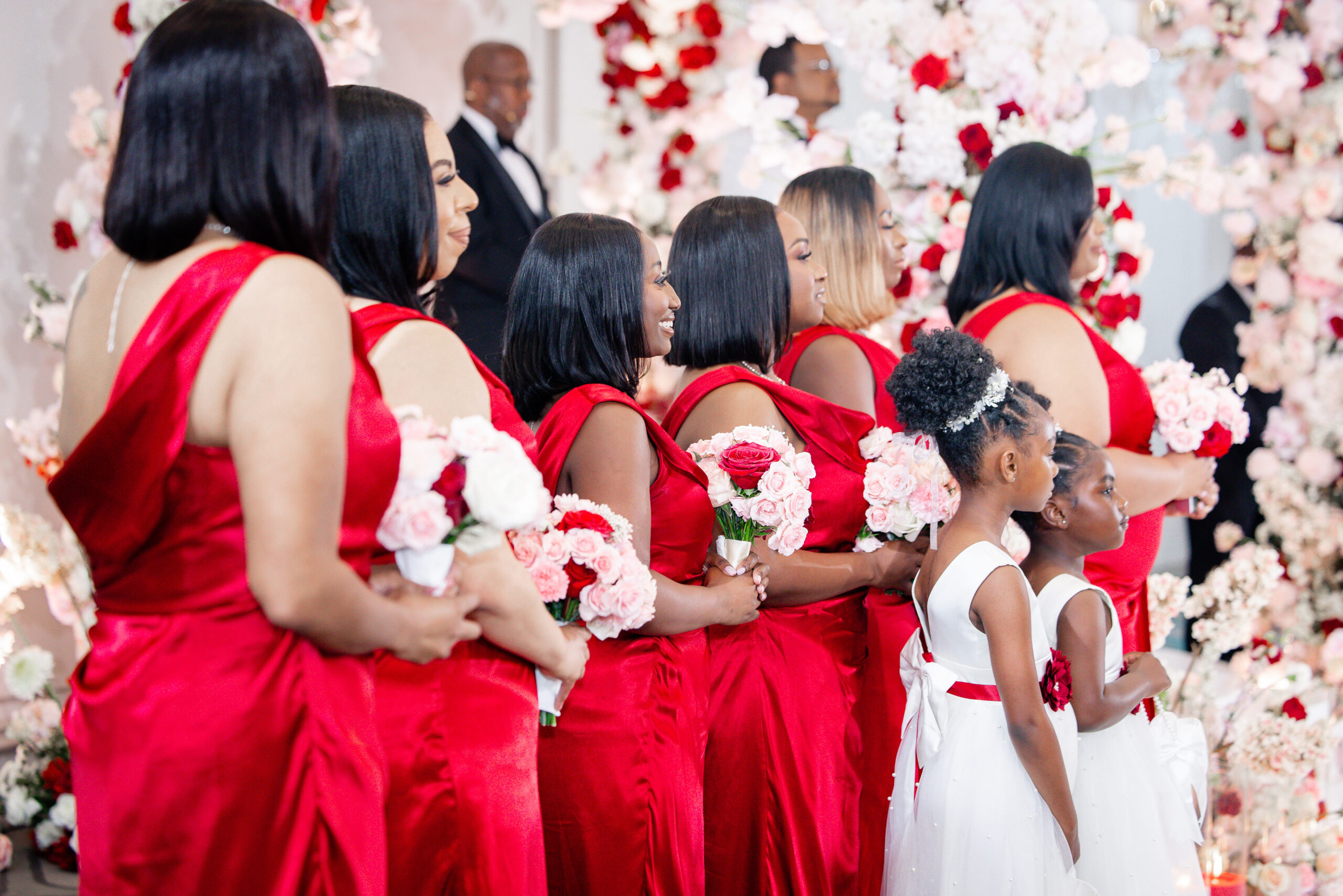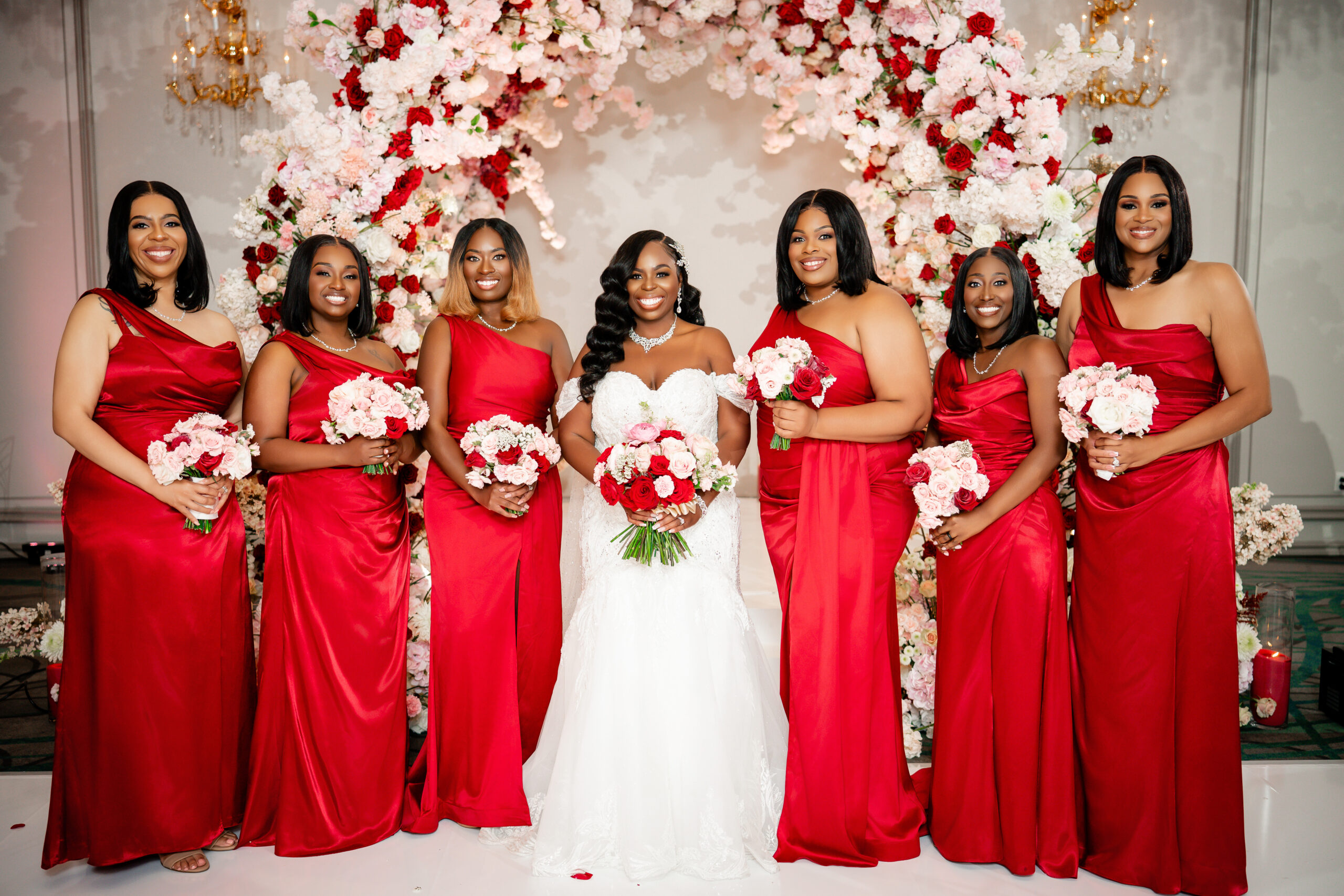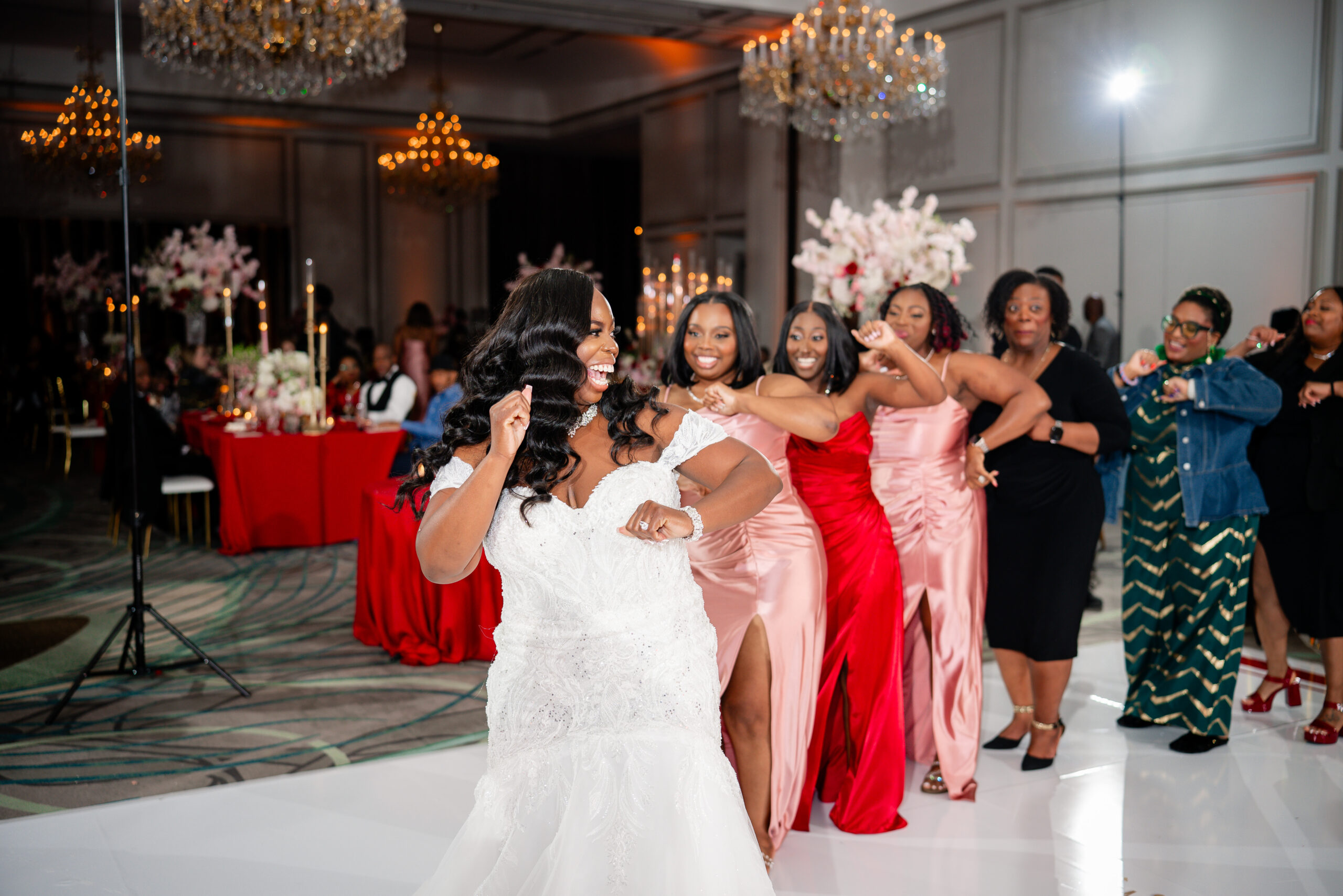 Bridal Gown: Bella’s Bridal. Bridesmaid Gowns: David’s Bridal. Cake: Barb’s Cakes. Catering, Venue, Wedding Night Accommodations: Grand Bohemian Mountain Brook. Ceremony Saxophonist: Willie Jazzanova Davis. Content Creator: De’Aundria McArthur. Custom Dance Floor Wrap: Laced Vinyl Shoppe. Event Rentals: Decor To Adore, Just Wright Events, PropHouse. Floral Design: The Perfect Creation. Groom’s Attire: Buy4Less Tuxedos. Groomsmen’s Attire: Arzel. Hair Stylist: MiRich Hair. Makeup Artist: Drea Michelle, Jasmine Jones. Lighting & Drapery, Music/Entertainment: B. Brian. Linen: Decor To Adore. MOB Gown: JJ’s House. Photography: Victor Cole Photography. Rings: Kay Jewelers. Stationery: Paper & More Creations. Transportation: Coats Classic Cars. Wedding Planner: Steele Unique Weddings & Events. Videographer: Harper Films.
