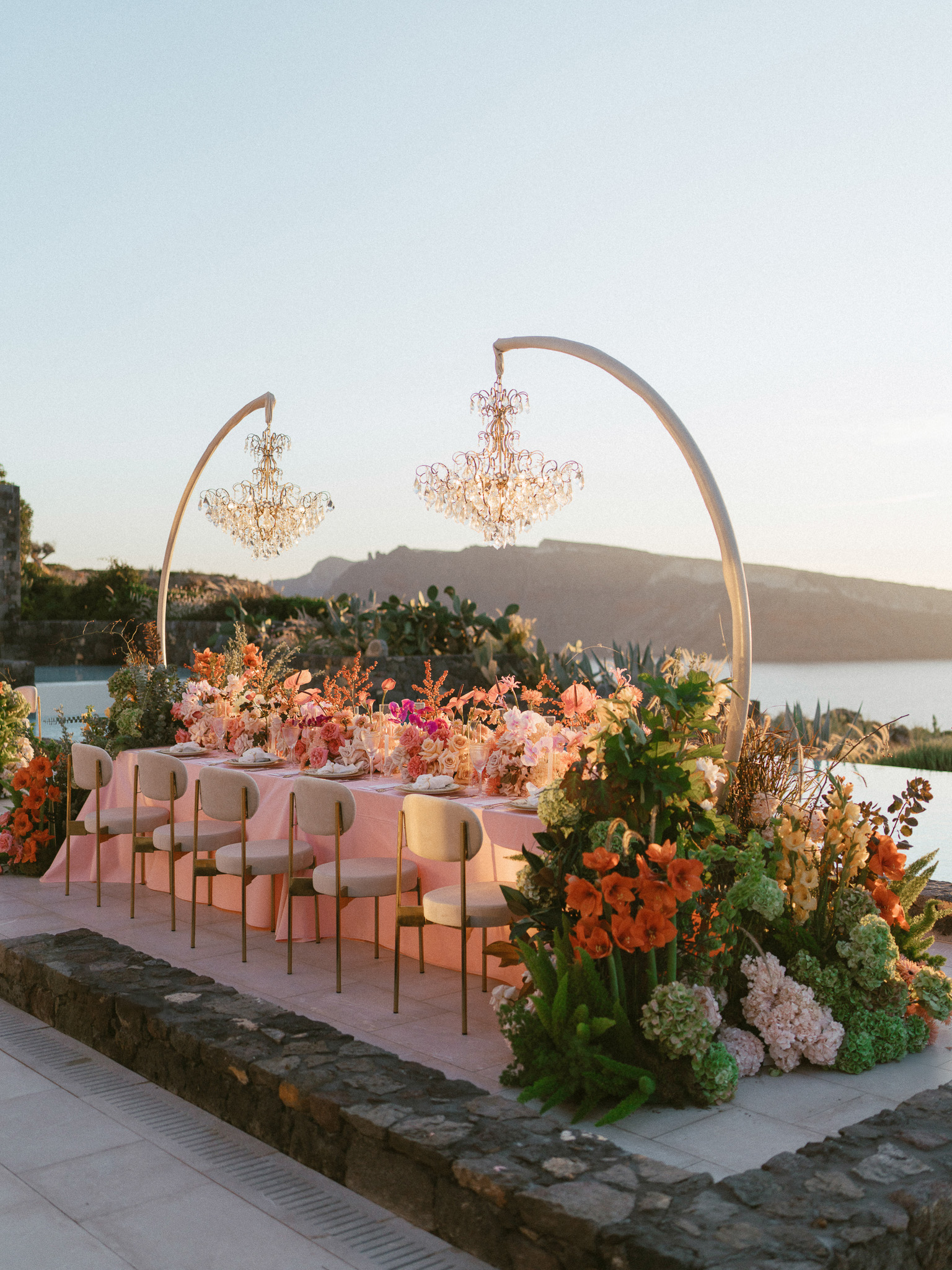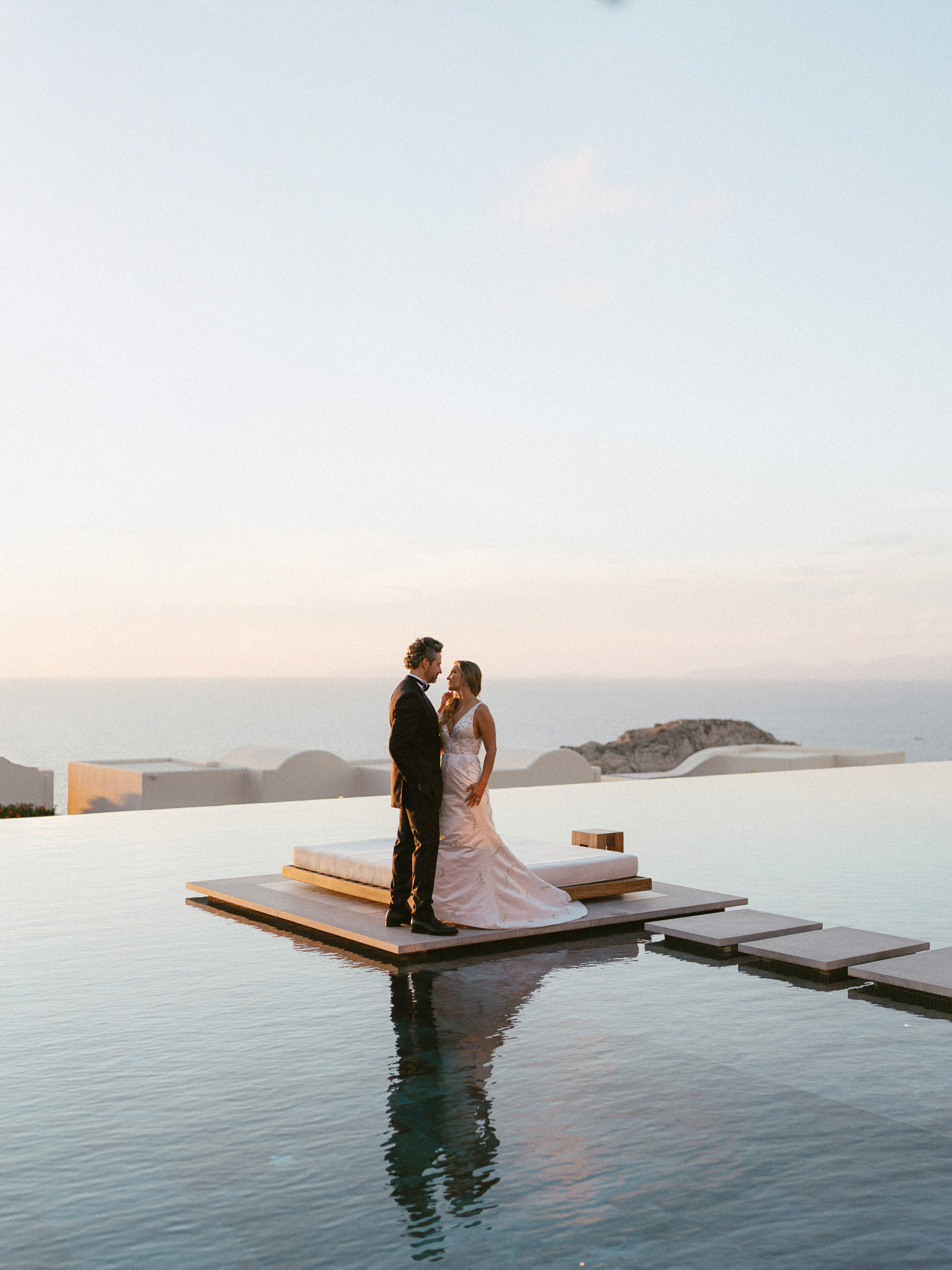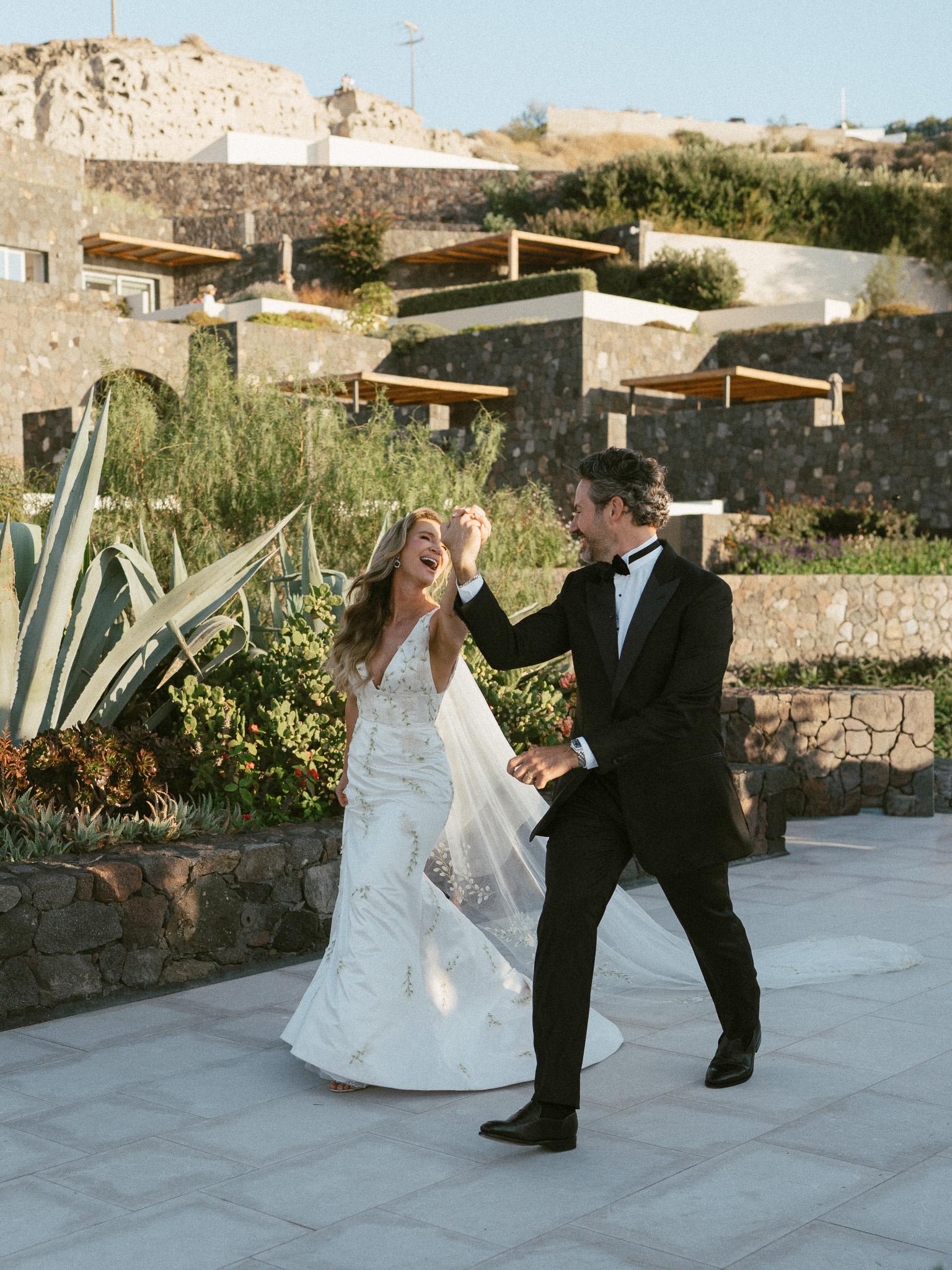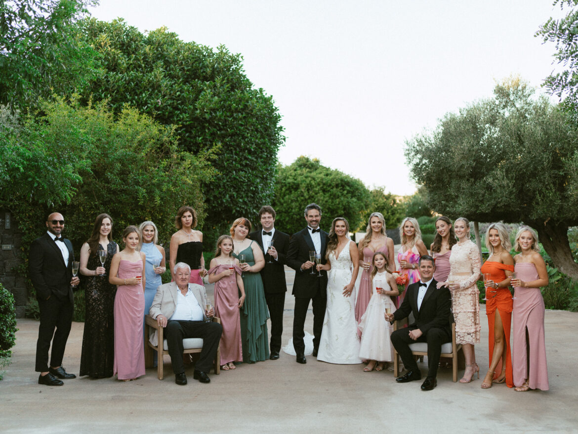 Bridal Gown: Custom Anne Barge from The White Room. Bridesmaid Gowns: Birdy Grey. Cake, Catering, Venue, Accommodations: Canaves Epitome. Floral Design: Manfler. Groom’s Attire: Bespoke Tuxedo by Shaia’s. Hair & Makeup: Caitlyn Moreno. Lighting: Santorini Events. Linen, Rentals: Maison Trilogie. Party Dress: Stuart Weitzman. Photography: Rachel Santos. Pianist: Markos Chaidemenos. Rings: Tiffany & Co.. Stationery: Paperhaus. Travel Planner: Mallory Lamm with Travelmation. Videography: Cinema of Poetry. Wedding Design, Planning, and Production: CONFERO.