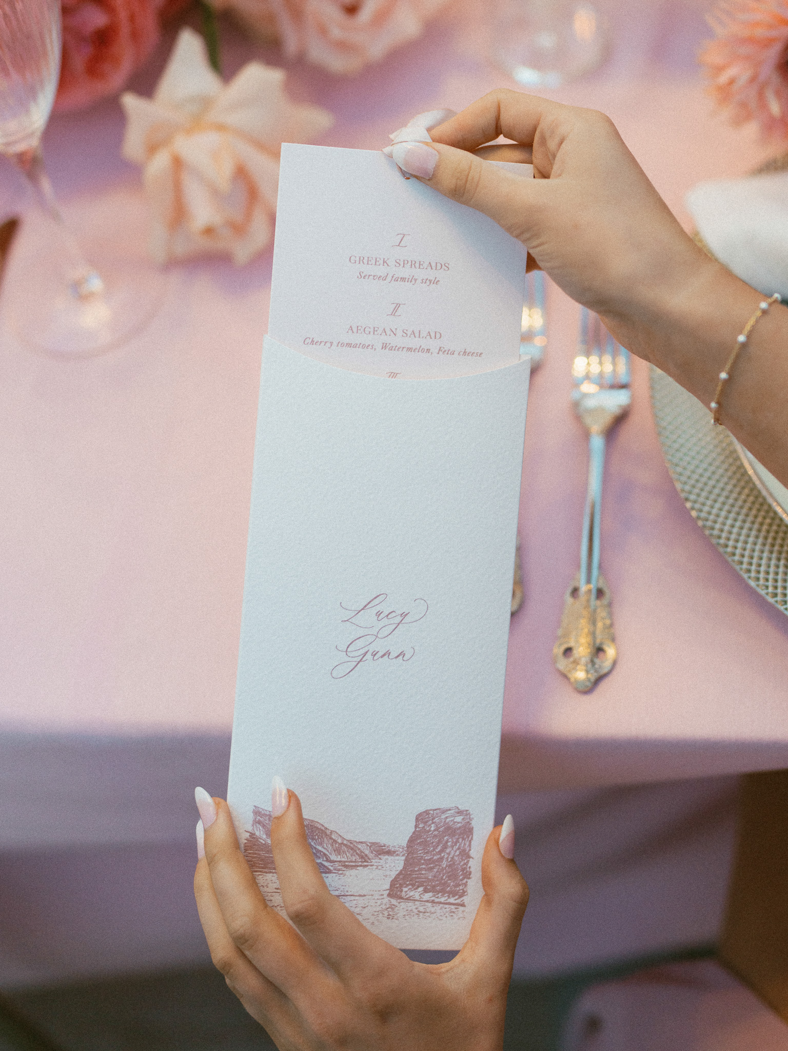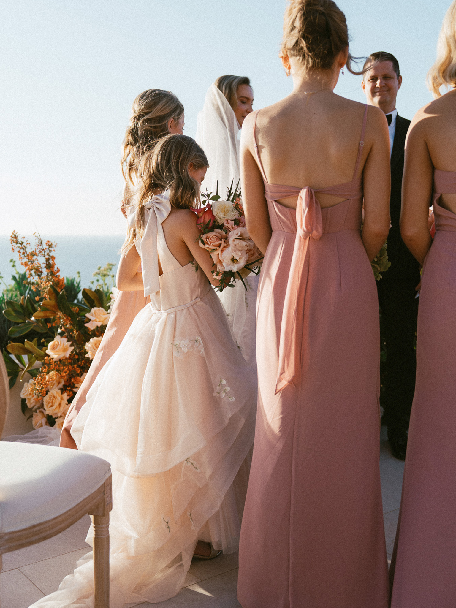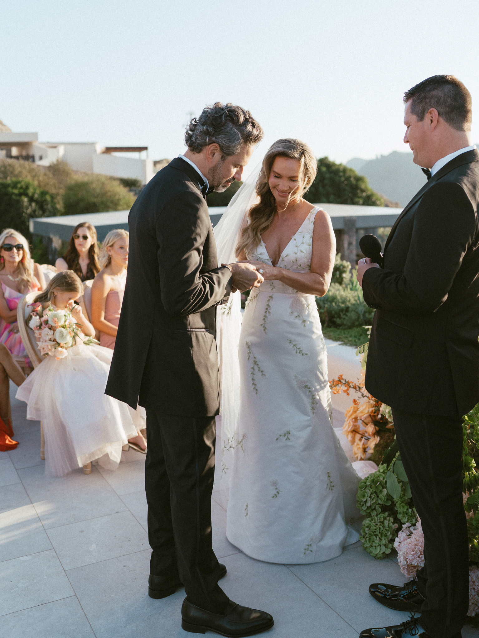 Bridal Gown: Custom Anne Barge from The White Room. Bridesmaid Gowns: Birdy Grey. Cake, Catering, Venue, Accommodations: Canaves Epitome. Floral Design: Manfler. Groom’s Attire: Bespoke Tuxedo by Shaia’s. Hair & Makeup: Caitlyn Moreno. Lighting: Santorini Events. Linen, Rentals: Maison Trilogie. Party Dress: Stuart Weitzman. Photography: Rachel Santos. Pianist: Markos Chaidemenos. Rings: Tiffany & Co.. Stationery: Paperhaus. Travel Planner: Mallory Lamm with Travelmation. Videography: Cinema of Poetry. Wedding Design, Planning, and Production: CONFERO.