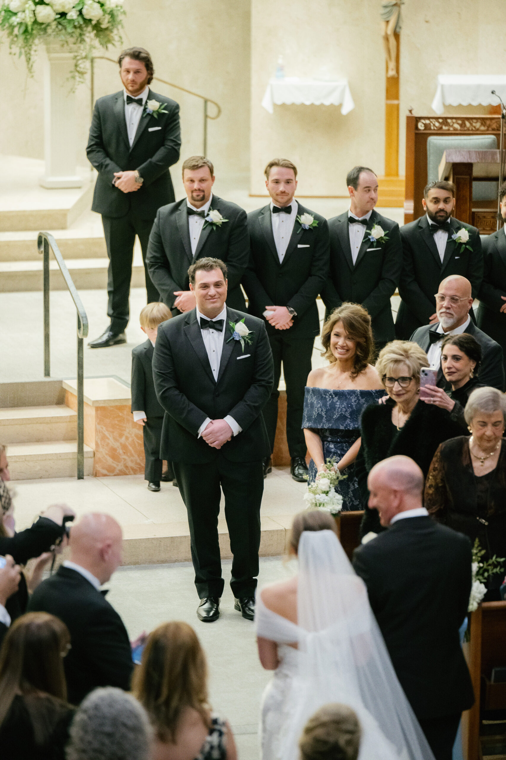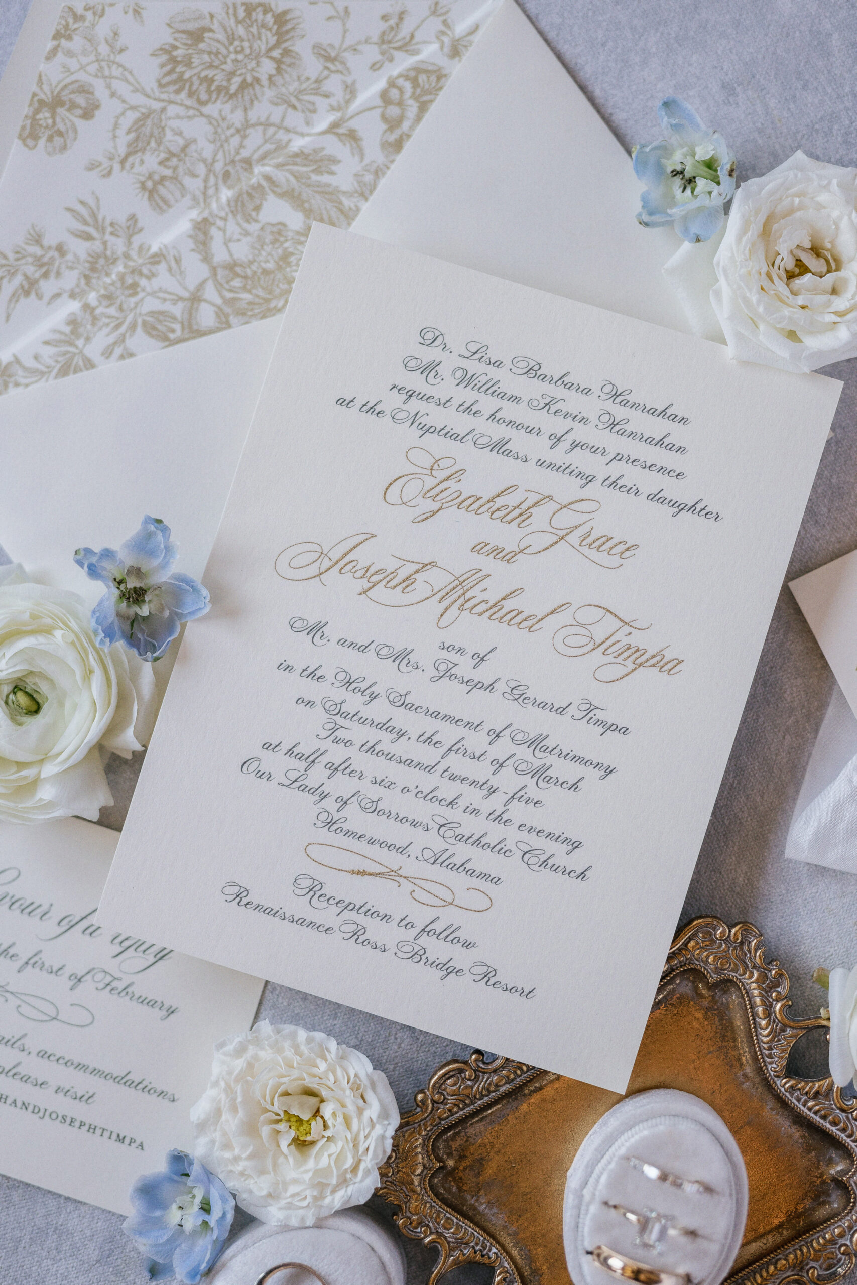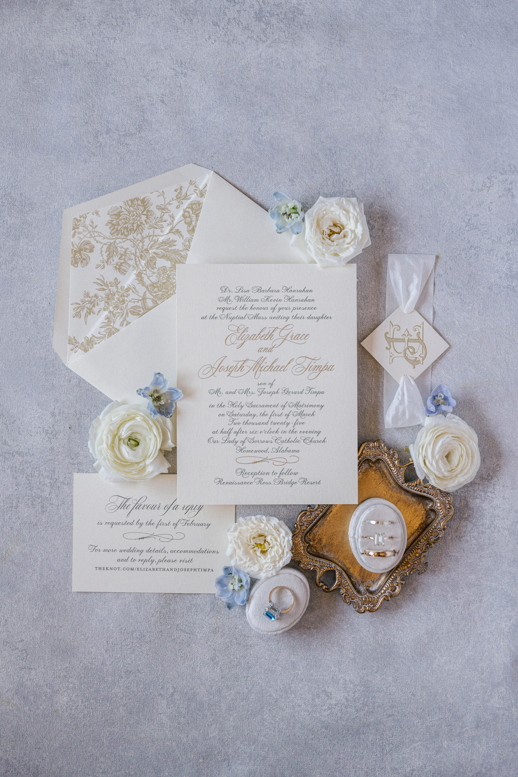 Bridal Gown: The White Room. Bridal Bouquet, Bridesmaid Bouquets: Bride’s Aunt Tara. Bridesmaid Gowns: Bella Bridesmaids. Cake: Louise’s Cakes. Ceremony Venue: Our Lady of Sorrows Catholic Church. Catering, Reception Venue: Renaissance Ross Bridge Golf Resort & Spa. Cold Sparks: Superior Sound Entertainment. Dance Floor Wrap: Southern Event Wraps. Floral Design: Vera Flora. Lounge Furniture & Décor: Prophouse. Groom’s & Groomsmen’s Attire: Men’s Wearhouse. Hair & Makeup: Hair and Makeup by Natalie Moore. Lighting & Draping Design: D4 Events. Linen: Stradley Davidson. Music/Entertainment: Emerald Empire Band. Photography: Eric and Jamie Photo. Rings: Anthony and Co. Jewelers. Stationery: Annabelle’s. Transportation: Prestige Limousine. Wedding Décor Papers: Fine Paperwork. Wedding Planner: Lauryn E. Weddings.