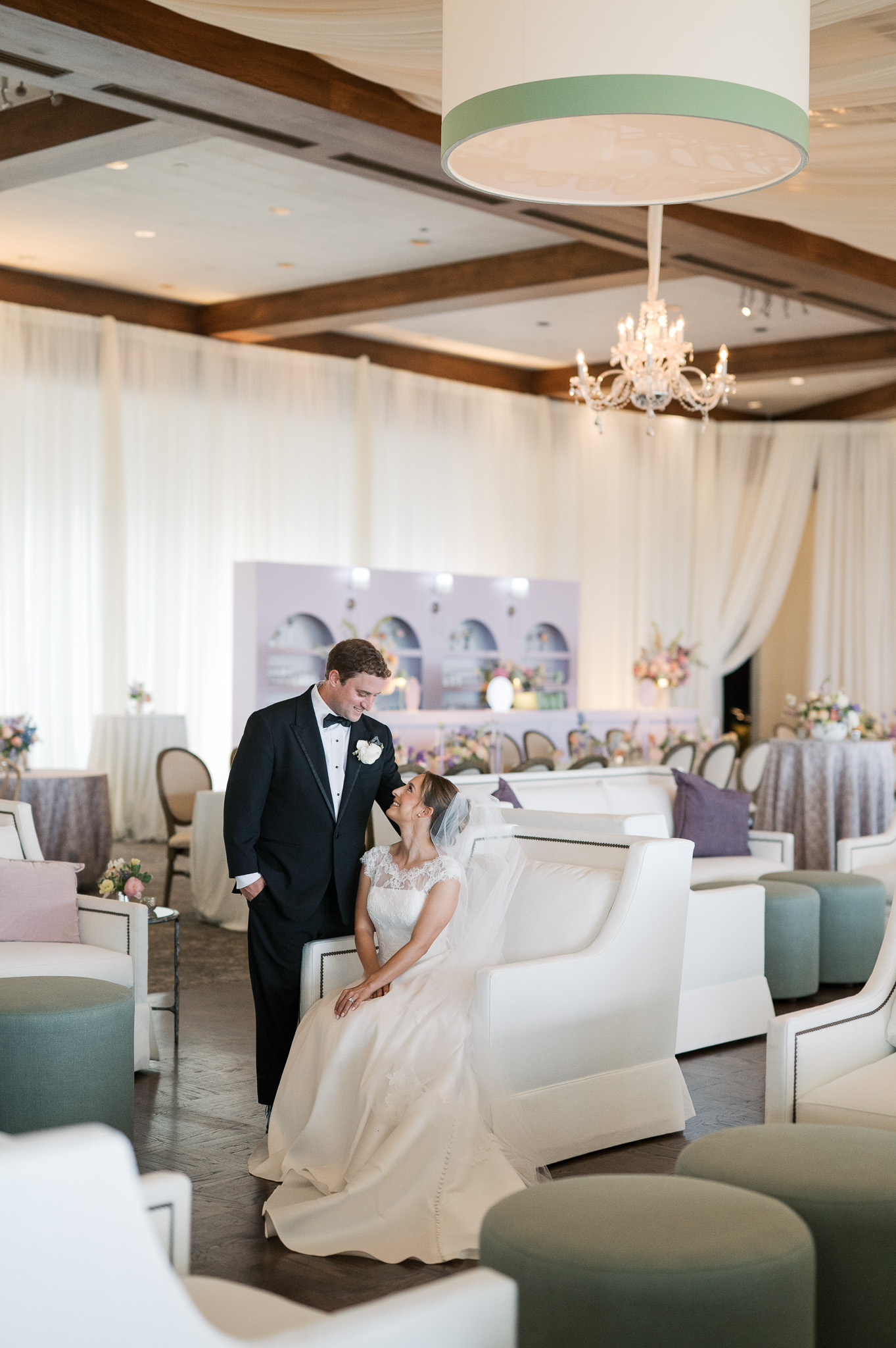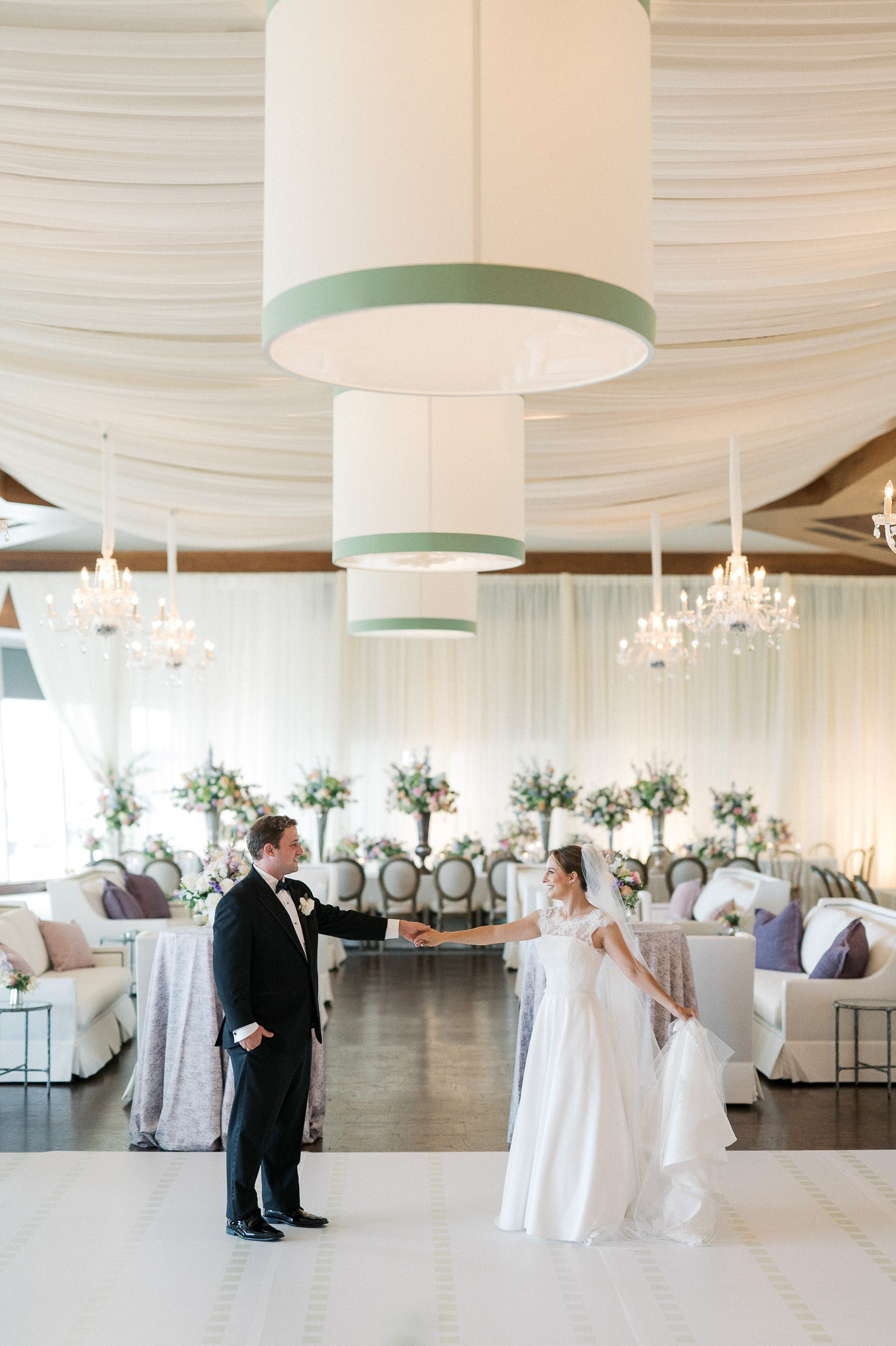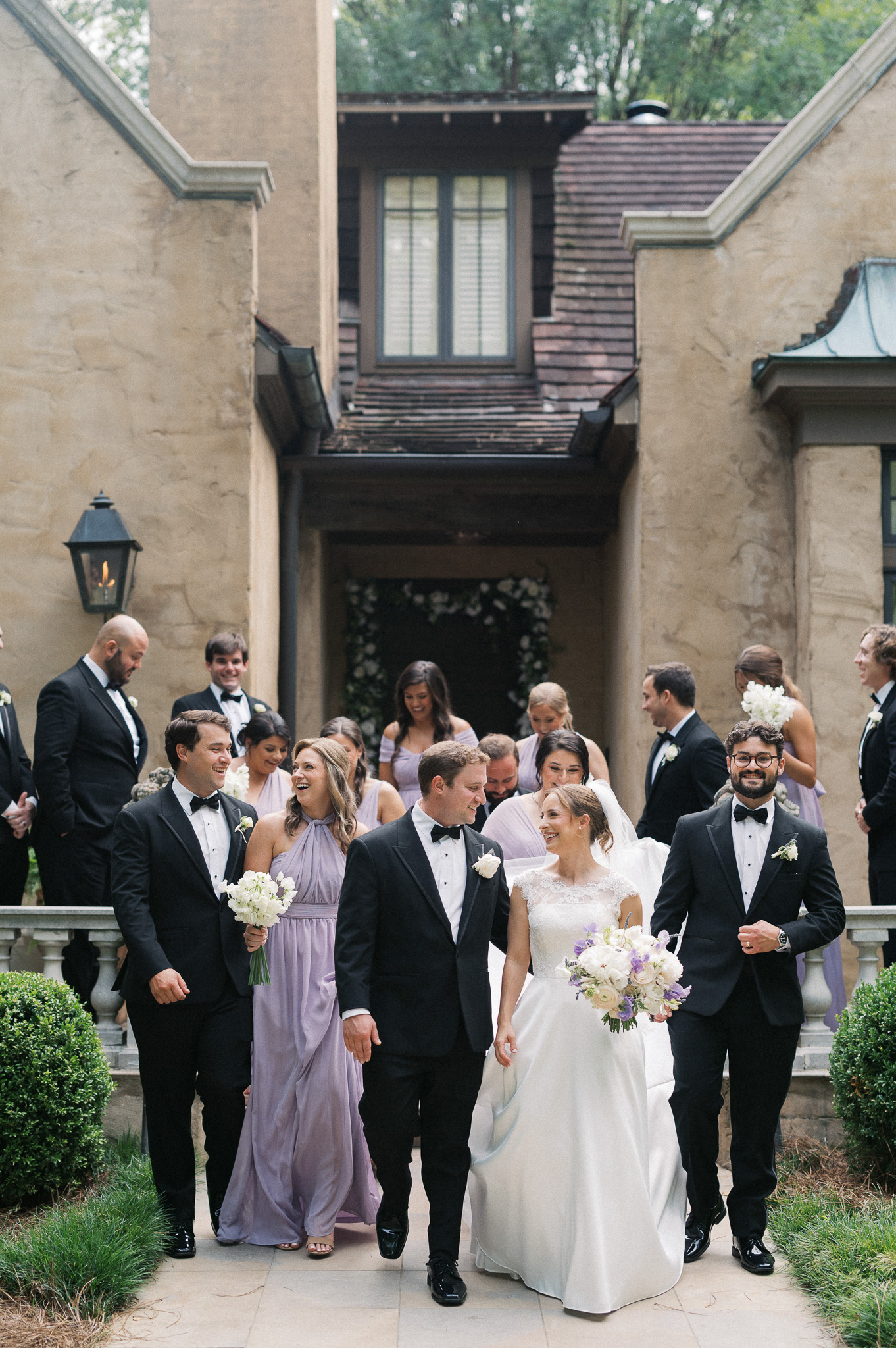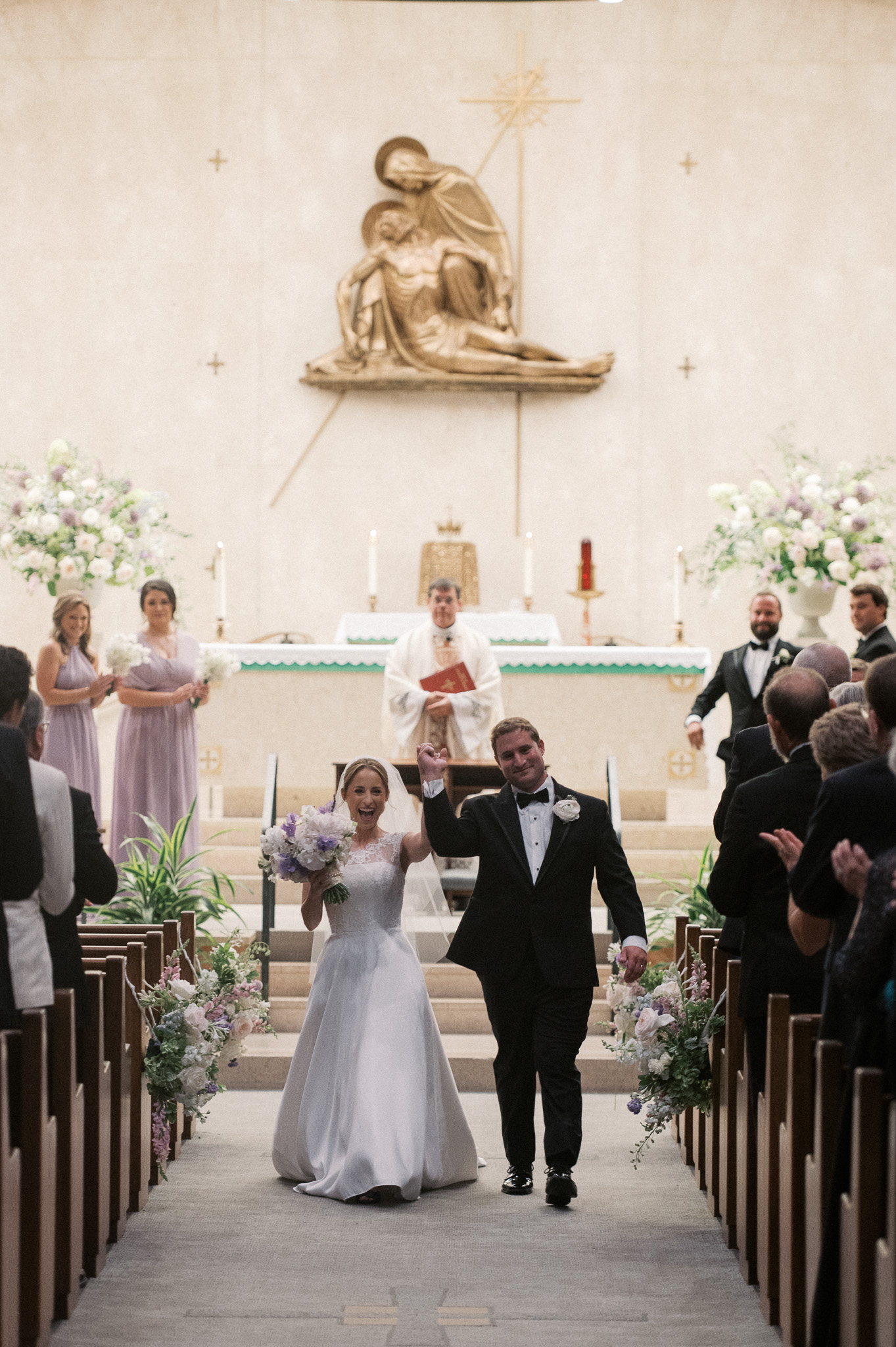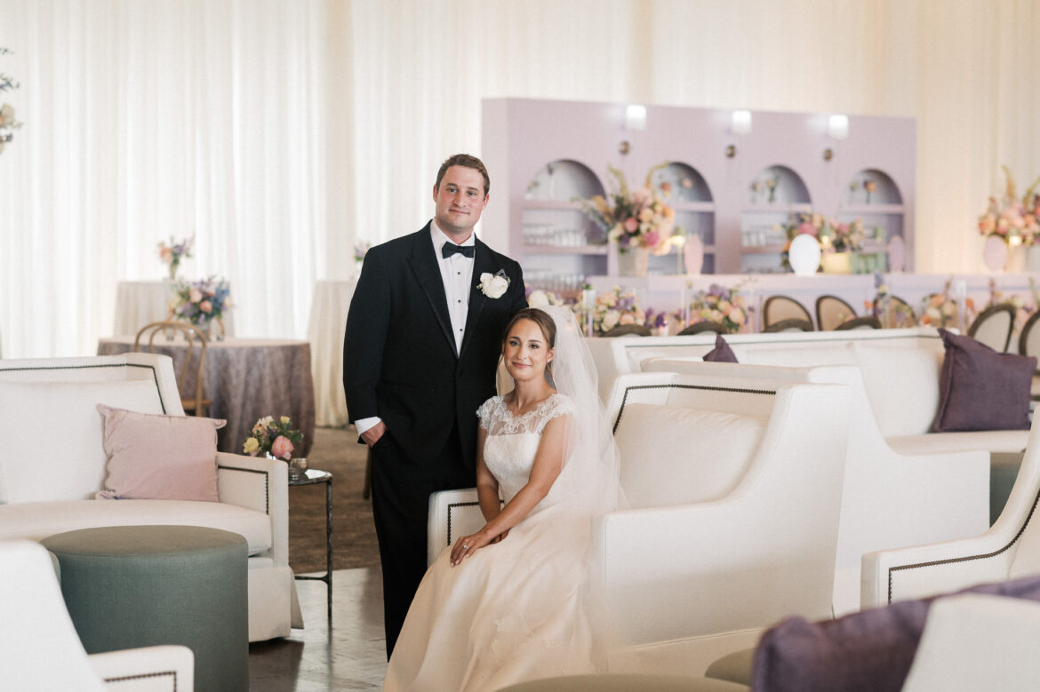 Bridal Gown: Carriage House Weddings. Bridesmaid Gowns: Birdy Grey. Cake: Barb’s Cakes. Ceremony Venue: Our Lady of Sorrows Catholic Church. Catering, Reception Venue: The Club. Dance Floor Wrap: Southern Event Wraps. Floral Design: Marigold Designs. Groom’s & Groomsmen’s Attire: Mr. Burch Formal Wear. Hair Stylist: Mandie Powell. Makeup Artist: Be-Loved Beauty. Lighting & Draping: AG Lighting. Linen: BBJ La Tavola, Stradley Davidson, Nuage Designs. Music/Entertainment: Universal Crush with East Coast Entertainment. Photography: Hannah Miller. Rentals: PropHouse, Soho Event Rentals. Rings: Southeastern Jewelers, Anthony and Co. Jewelers. Stationery: Empress Stationery. Transportation: Rare Transportation. Wedding Planner: Becky’s Brides.