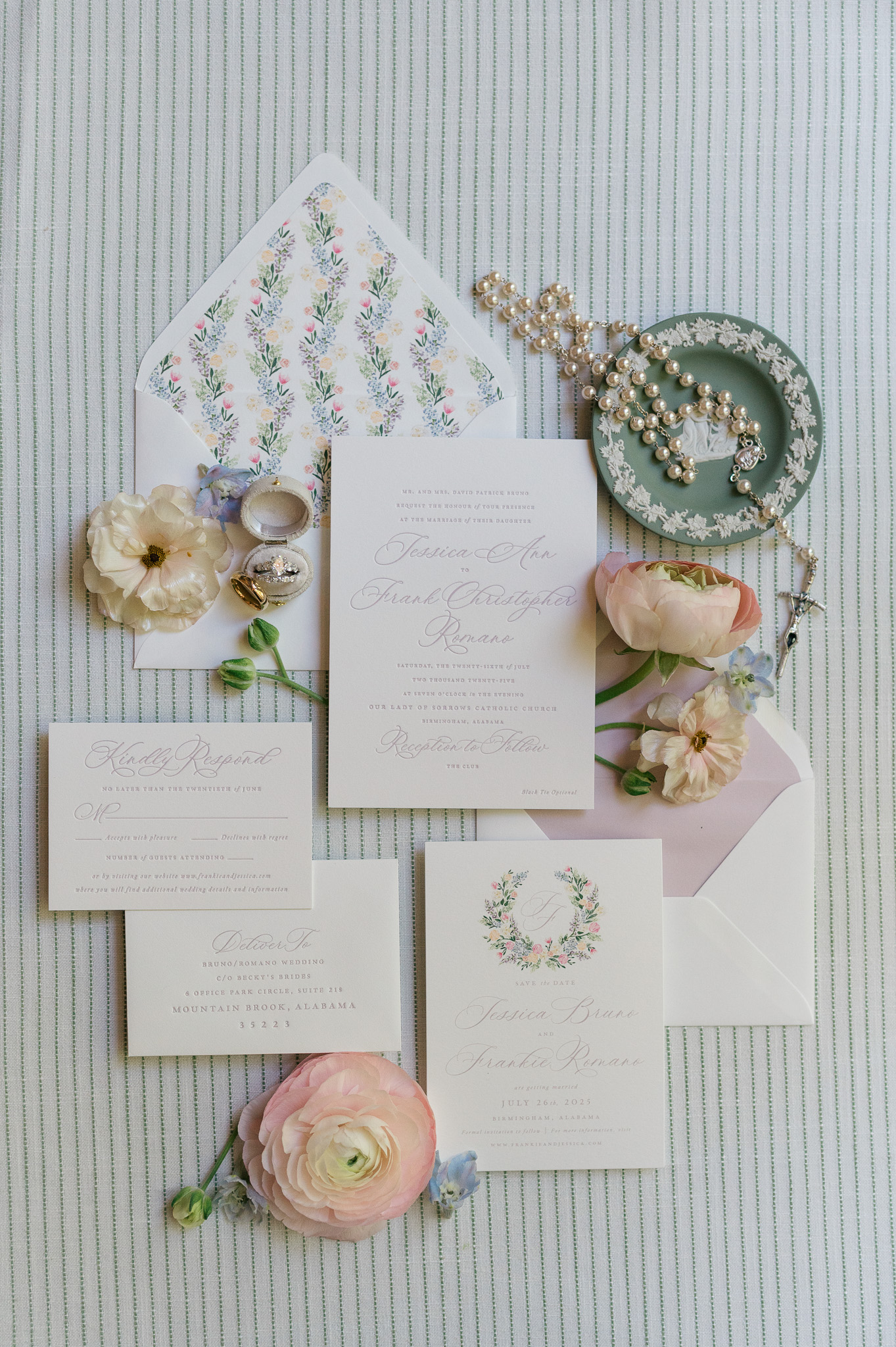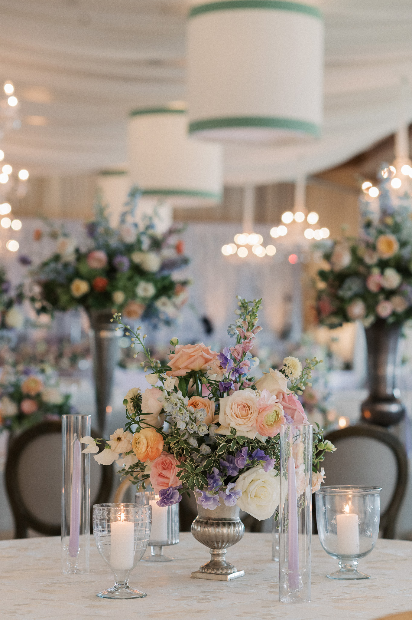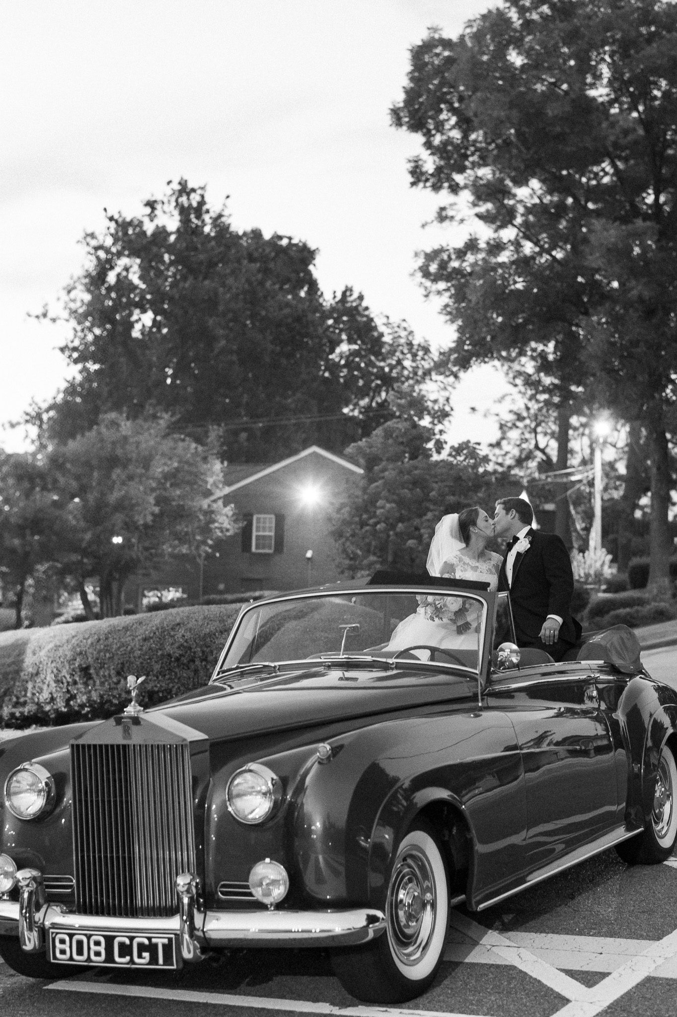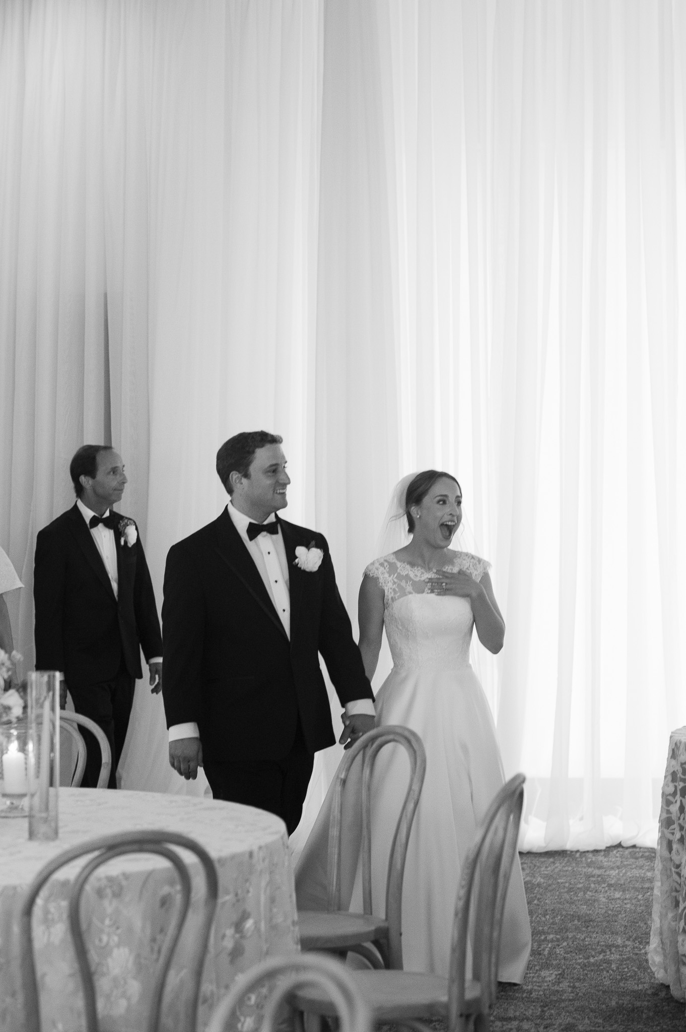 Bridal Gown: Carriage House Weddings. Bridesmaid Gowns: Birdy Grey. Cake: Barb’s Cakes. Ceremony Venue: Our Lady of Sorrows Catholic Church. Catering, Reception Venue: The Club. Dance Floor Wrap: Southern Event Wraps. Floral Design: Marigold Designs. Groom’s & Groomsmen’s Attire: Mr. Burch Formal Wear. Hair Stylist: Mandie Powell. Makeup Artist: Be-Loved Beauty. Lighting & Draping: AG Lighting. Linen: BBJ La Tavola, Stradley Davidson, Nuage Designs. Music/Entertainment: Universal Crush with East Coast Entertainment. Photography: Hannah Miller. Rentals: PropHouse, Soho Event Rentals. Rings: Southeastern Jewelers, Anthony and Co. Jewelers. Stationery: Empress Stationery. Transportation: Rare Transportation. Wedding Planner: Becky’s Brides.