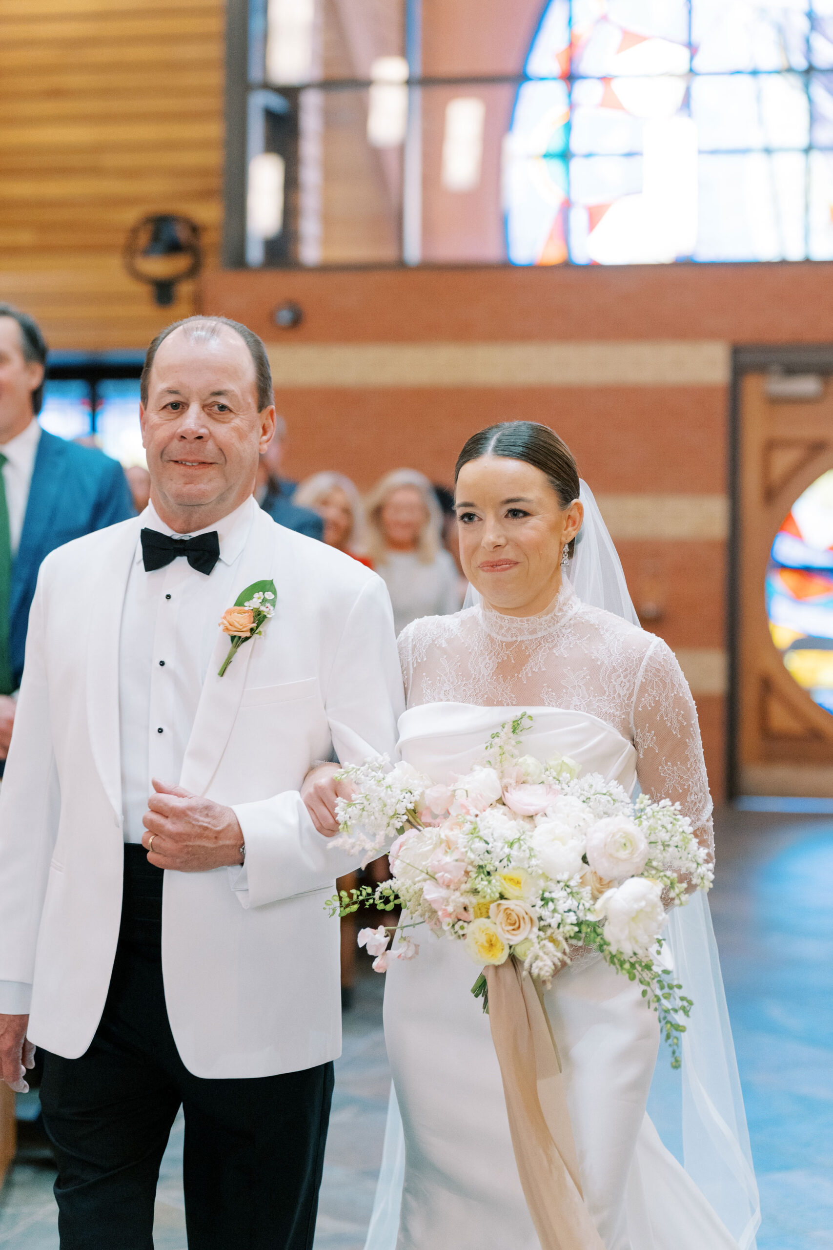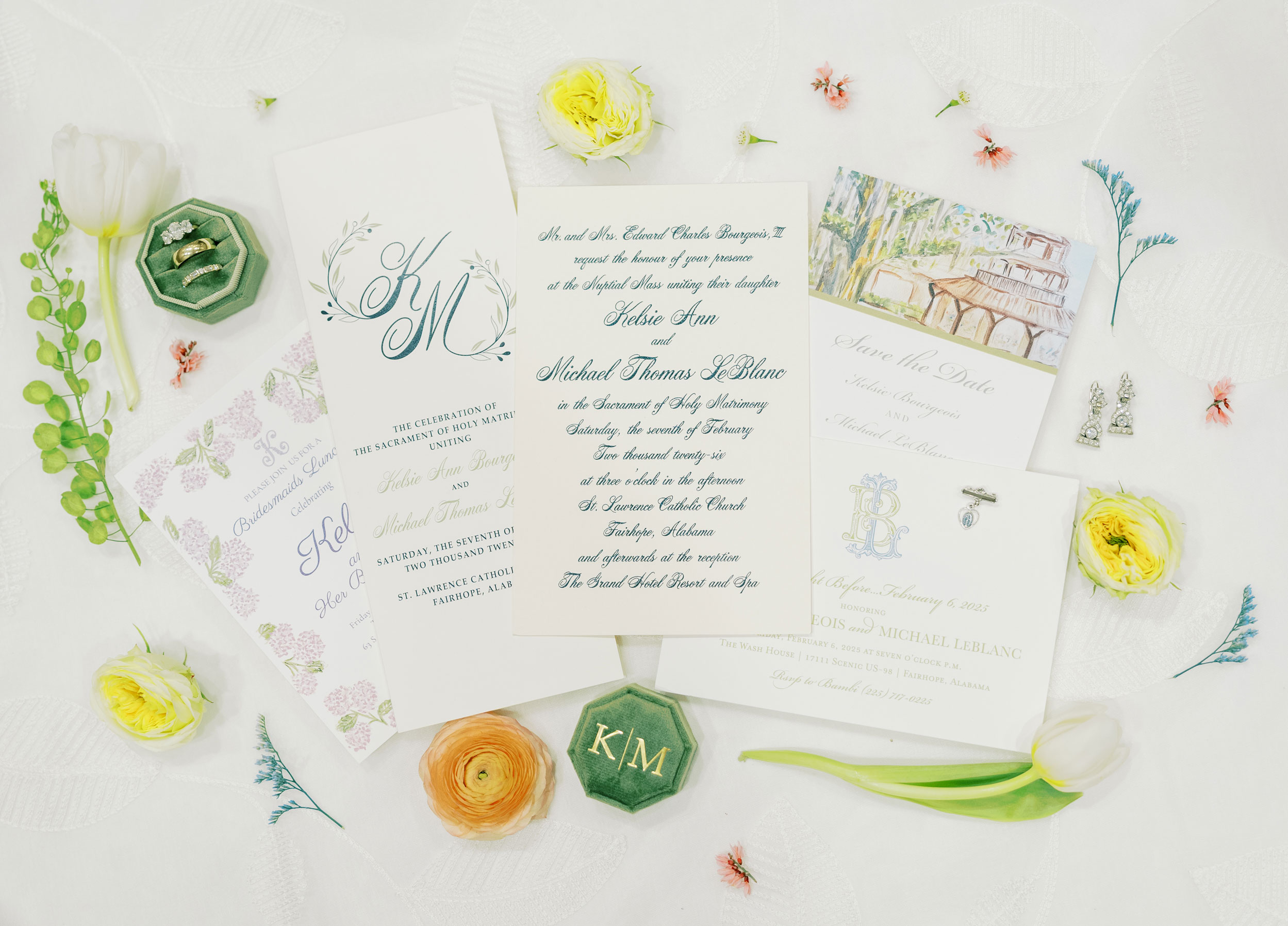 Bridal Gown: I Do Bridal – Covington, LA. Cake: Underground Custom Cakes. Catering, Reception Venue, Wedding Night Accommodations: Grand Hotel Golf Resort . Ceremony Venue: St. Lawrence Catholic Church. Event Rentals, Linen: Port City Rentals. Floral Design: Jubilee Flowers. Groom’s & Groomsmen’s Attire: Squires Formalwear. Hair & Makeup: Brushed + Blushed. Lighting & Drapery: Snider Bros. Music/Entertainment: 4 Barrel Funk. Photography: Emma Kent Photography. Videographer: Shannon Talamo Films. Wedding Planner: AMM Events.