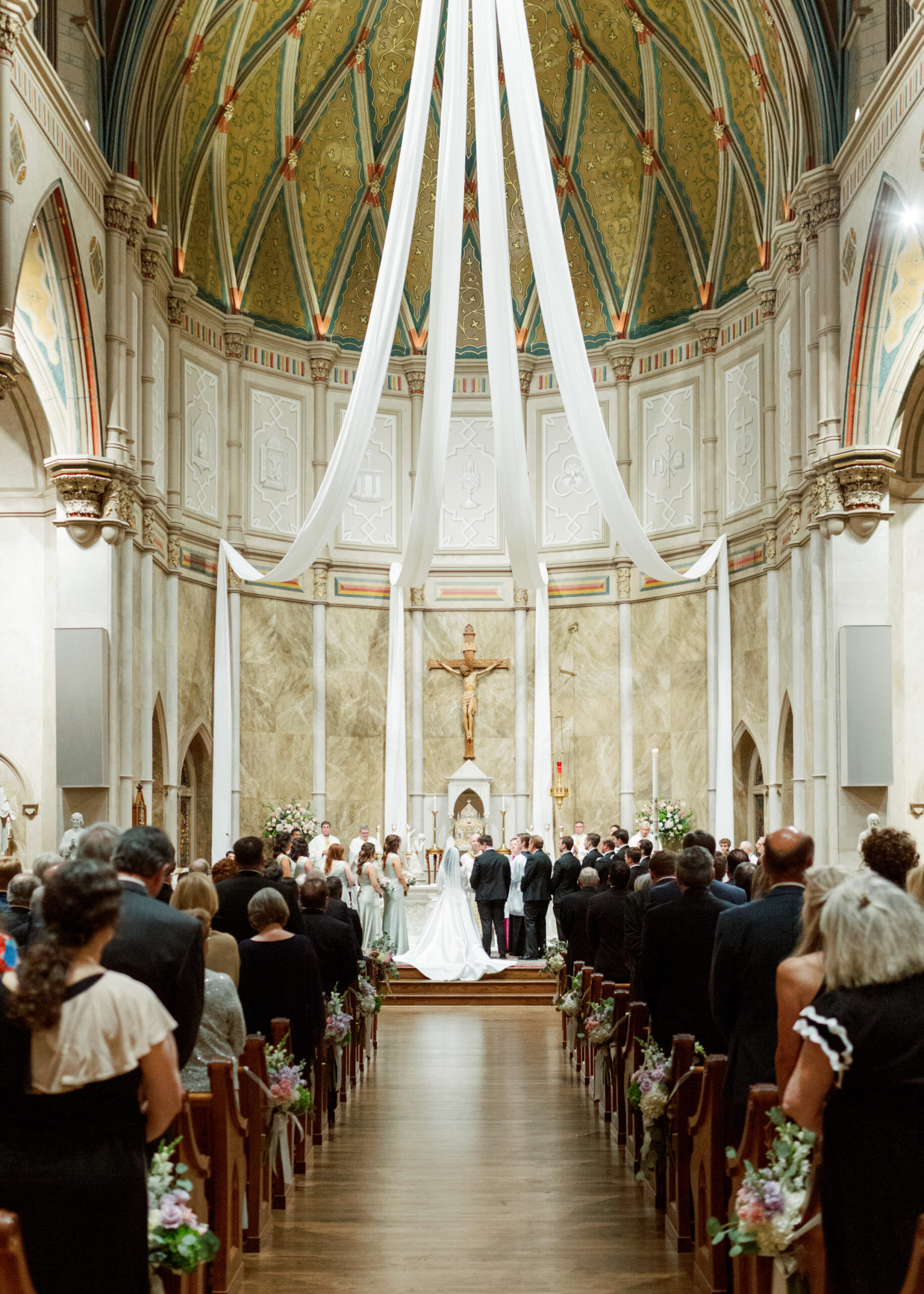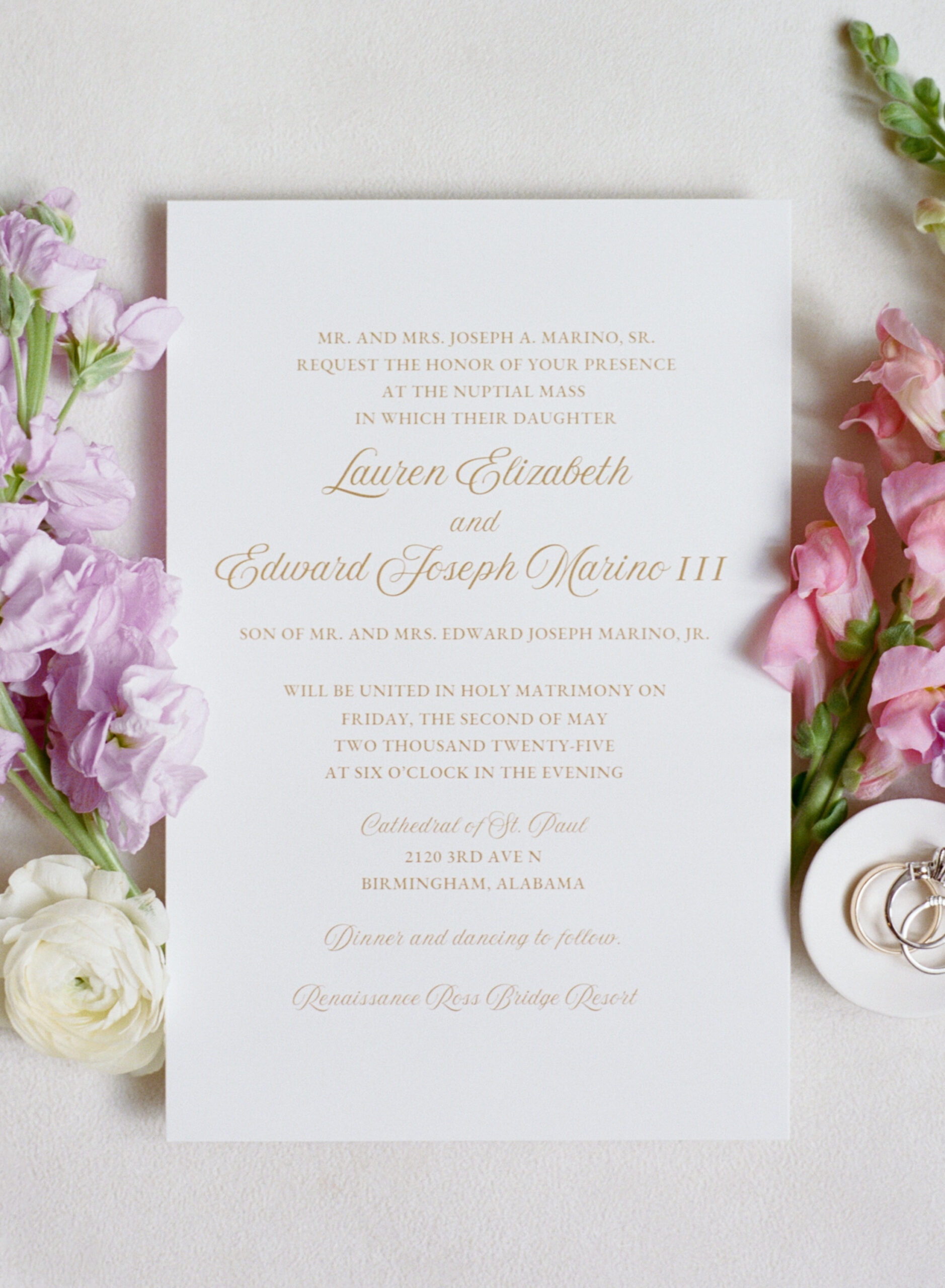 Bridal Gown: Ivory and White Boutique. Bridesmaid Gowns: AW Bridal. Cake: Magic Muffins. Catering, Reception Venue, Wedding Night Accomodations: Renaissance Birmingham Ross Bridge Golf Resort & Spa. Ceremony Venue: The Cathedral of Saint Paul. Ceremony Floral Design: Mary Noel Sellers. Desserts: Annie Marino, Johanna and Fred Kimeny. Event Rentals, Linen: Decor to Adore. Groom’s & Groomsmen’s Attire: Mr. Burch Formal Wear. Hair and Makeup: Asia Nicole. Lighting & Draping Design: D4 Events. Music/Entertainment: St. Paul’s Cathedral Choir, Dr. Sharon Lawson, The Chekmates, Joey Marino, Jr., Norris Dates and Power Surge. Photography: Jana Musselwhite Photography. Reception Floral Design: RD Designs. Registry: Bromberg’s, Williams Sonoma, Pottery Barn. Rings: Southeastern Jewelers. Stationery: Lauren Marino, Big Color Printing. Videographer: Bright & Gray Creative. Wedding Crest Design: Natalie Vizzina. Wedding Party Attire: The Clothes Tree by Deborah.
