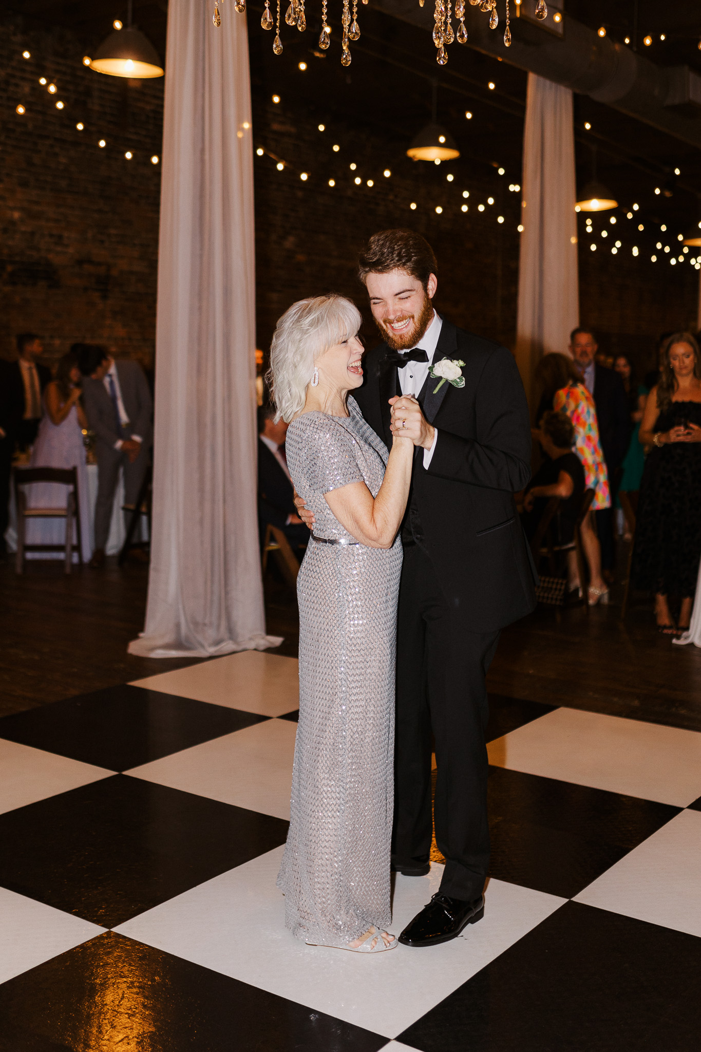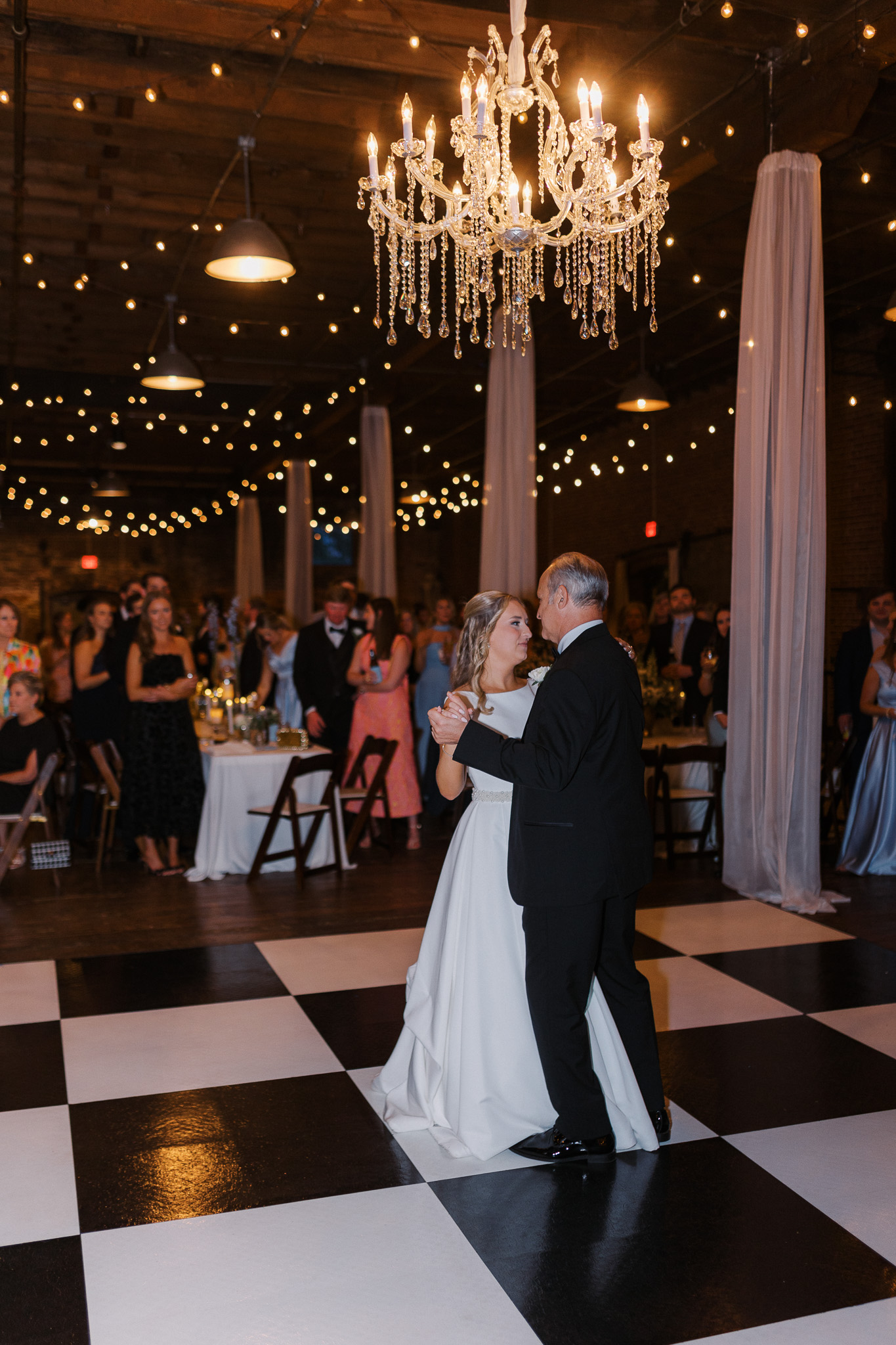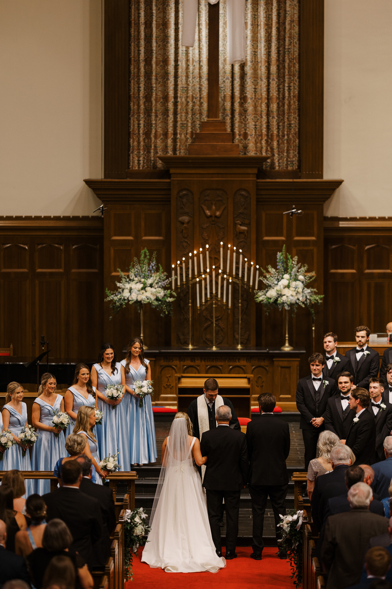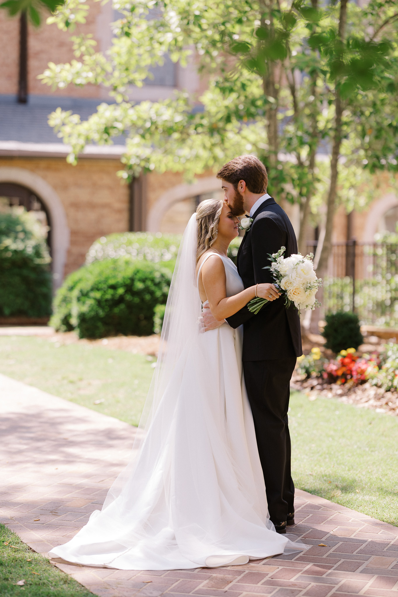 Bridal Gown: Bustle Gowns. Bridesmaid Gowns: JJ’s House. Cake: Cakes by Janice. Ceremony Venue: Trinity United Methodist Church. Catering, Reception Venue: B&A Warehouse. Floral Design: Jim Barron. Lighting & Draping Design, Rentals: D4 Events. Groom’s & Groomsmen’s Attire: Men’s Wearhouse. Hair & Makeup: Isabel Estes. Music/Entertainment: Emerald Empire Band. Photography: Prestley Bramlett Clark. Stationery: Please Reply. Transportation: Accent Luxury Limo. Wedding Planner: Jill Sims. Wedding Party Attire: The Clothes Tree by Deborah.