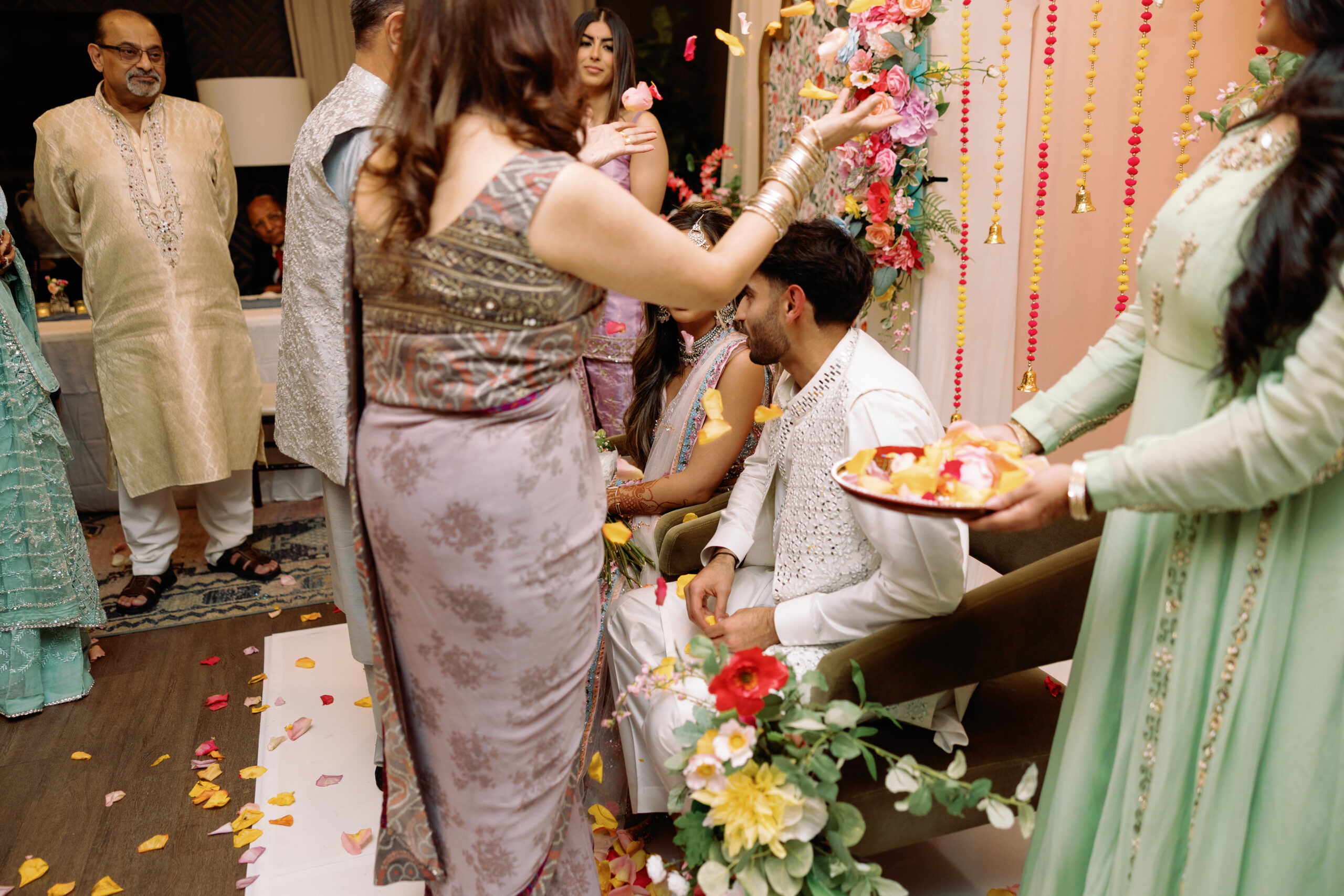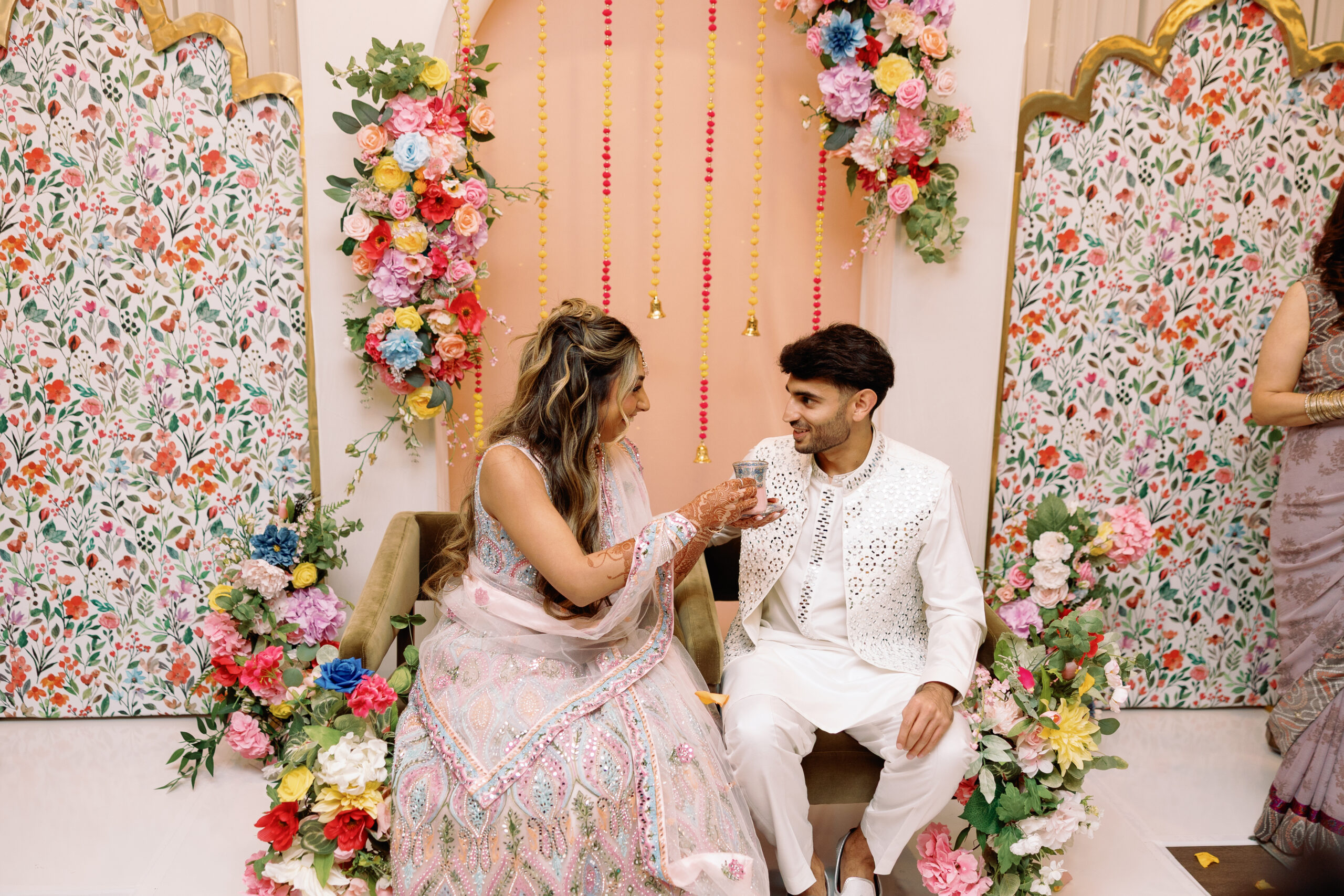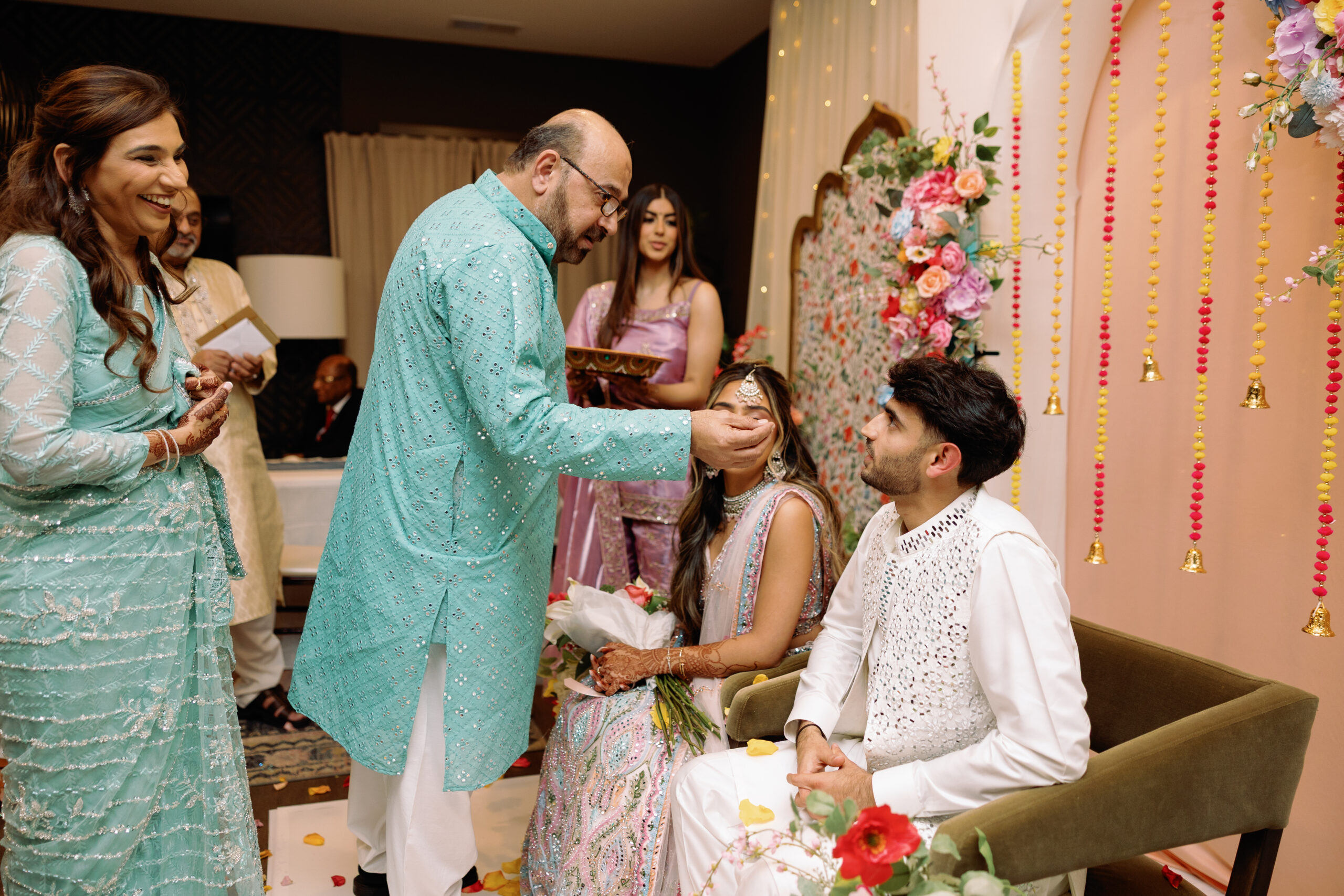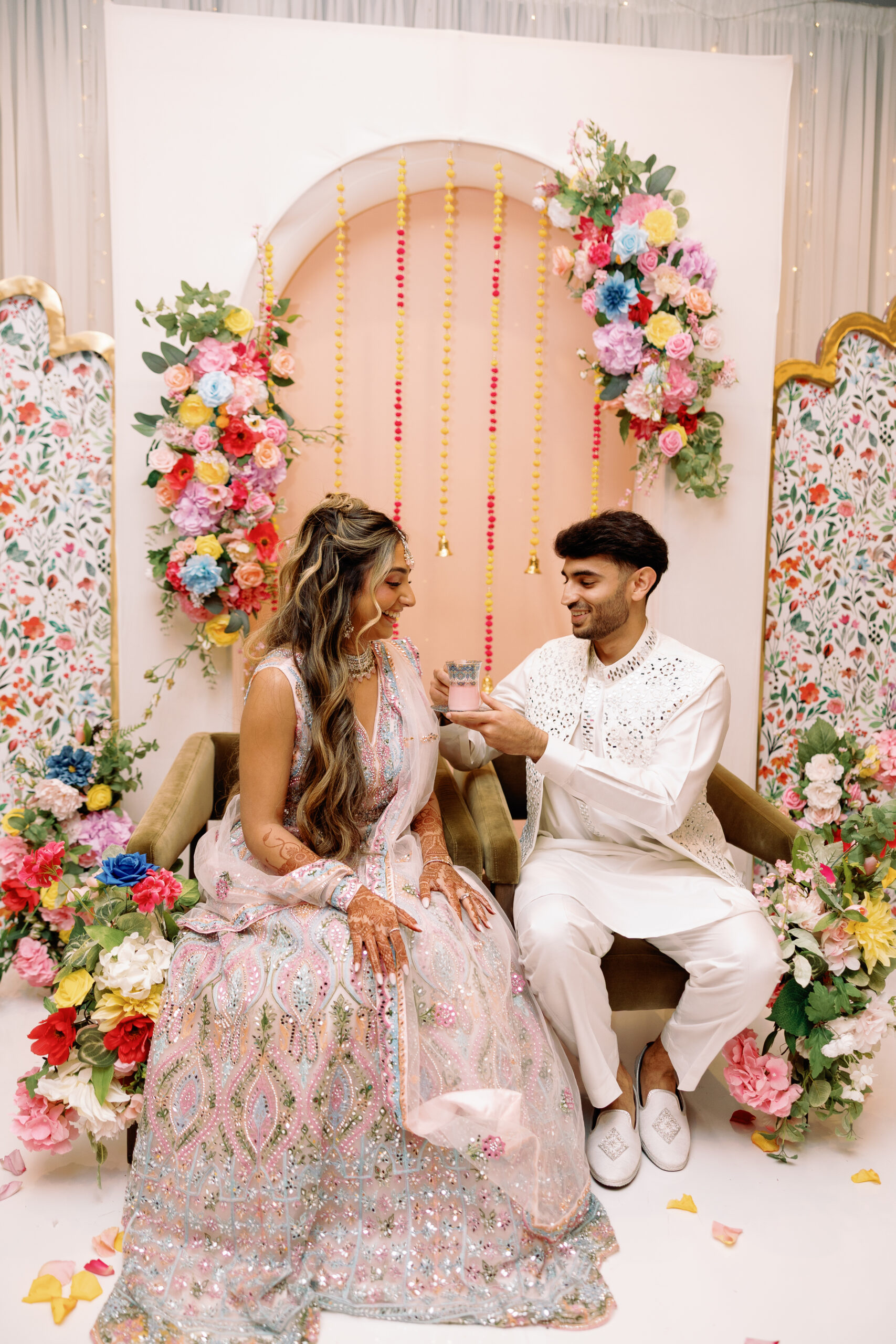 “A mitha mu is a traditional pre-wedding ceremony in South Asian Muslim cultures that formally marks the families’ agreement to the marriage. The name means “sweet mouth,” symbolizing the sharing of good news and the sweetness of the relationship ahead. During the ceremony, families exchange sweets, gifts and sometimes rings, and offer prayers or duas for blessings. In some families, this also includes a “doodh pilai” ritual, in which the couple drinks milk together from the same cup to symbolize purity, unity and the beginning of their life together. Overall, it is an intimate, joyful gathering that celebrates the joining of two families and the intention to move forward toward the engagement and wedding.” – Soha